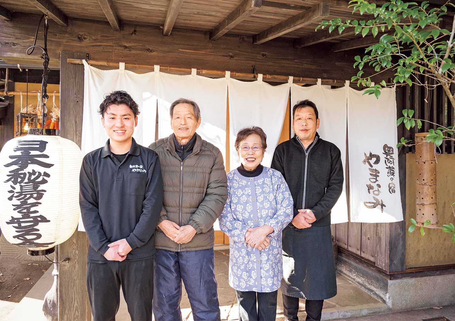 産山温泉『やまなみ』若旦那の森本武蔵さん・初代の幸隆さん・女将の節子さん・2代目社長の隆文さん(左から)