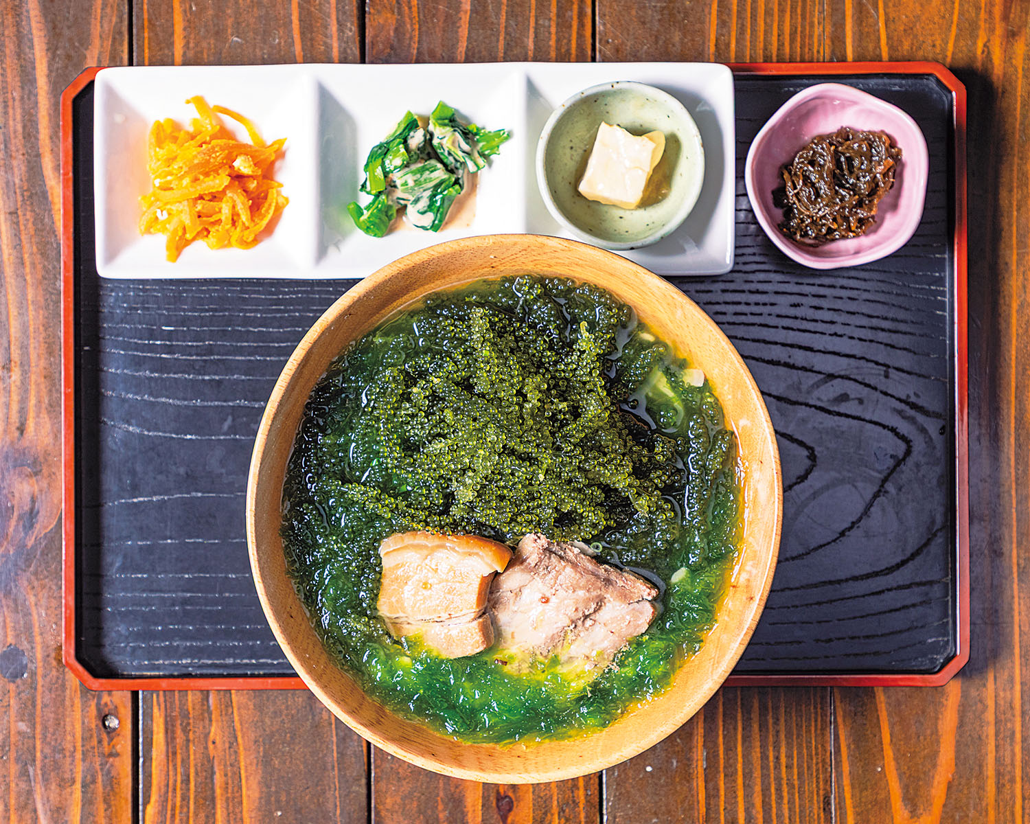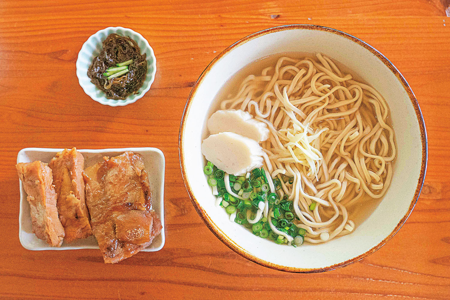 全粒粉にカツオ節を練り込んだ自家製麺と無添加あぐー出汁スープには、ミネラル豊富な「屋我地(やがじ)の塩」が使われ、味わい深い。屋我地島の大らかな景色を眺めながら、隅々まで絶品なそばを食べるという贅沢をぜひ。