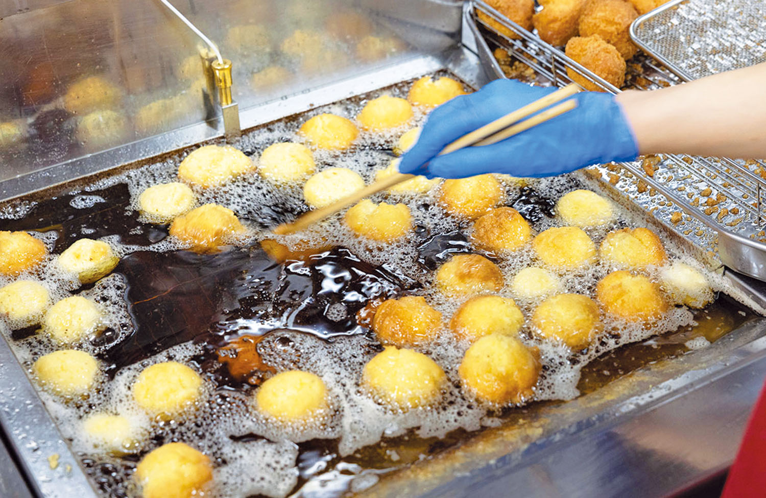 仕上がりは軽く、サクサクッとした歯ごたえがたまらない。米油で揚げているため時間が経っても酸化しにくく、揚げ物独特のにおいもなし。小ぶりで胃もたれもしにくいので、つい2、3個と手が伸びる。