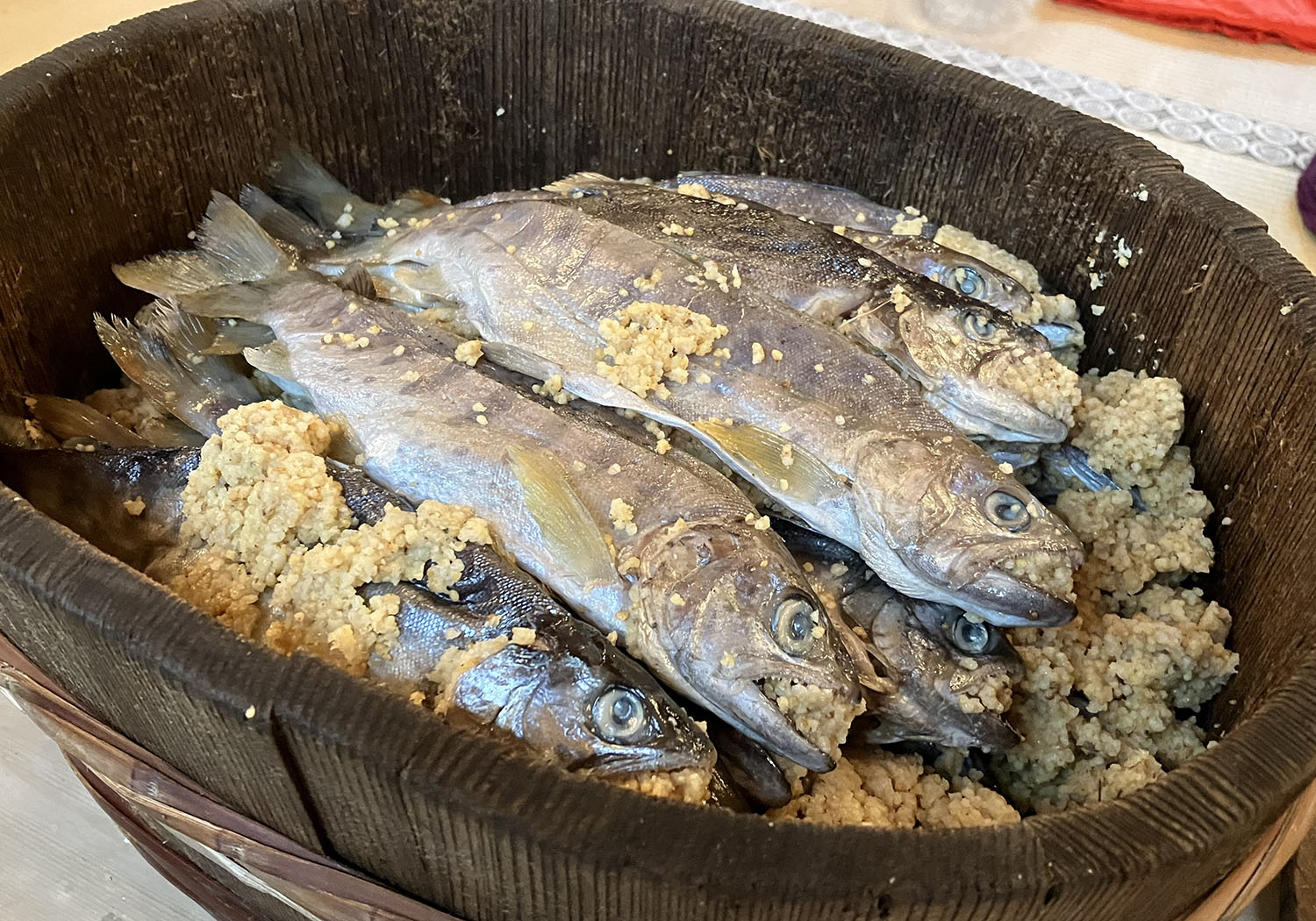 今は木桶にイタドリの葉を敷き、塩、塩漬けしたヤマメ(粟入り)と重ね、イタドリの葉で蓋をする。これを何段か繰り返した状態で1日置くだけなので、発酵はしていないけれど、昔はもしかしたら数日置いて発酵させていたの……かも!?
