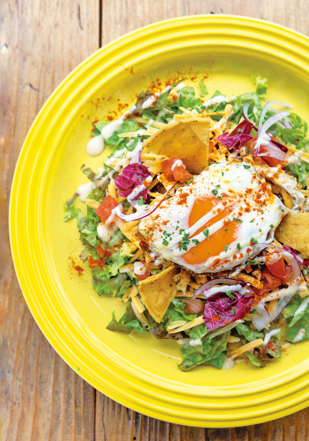 鶏出汁で炊いた白米にたっぷりの野菜とチーズ、トルティーヤチップス、目玉焼きがトッピングされ、ひと口ごとに新しい発見があり、記憶にもしっかりと刻まれる。