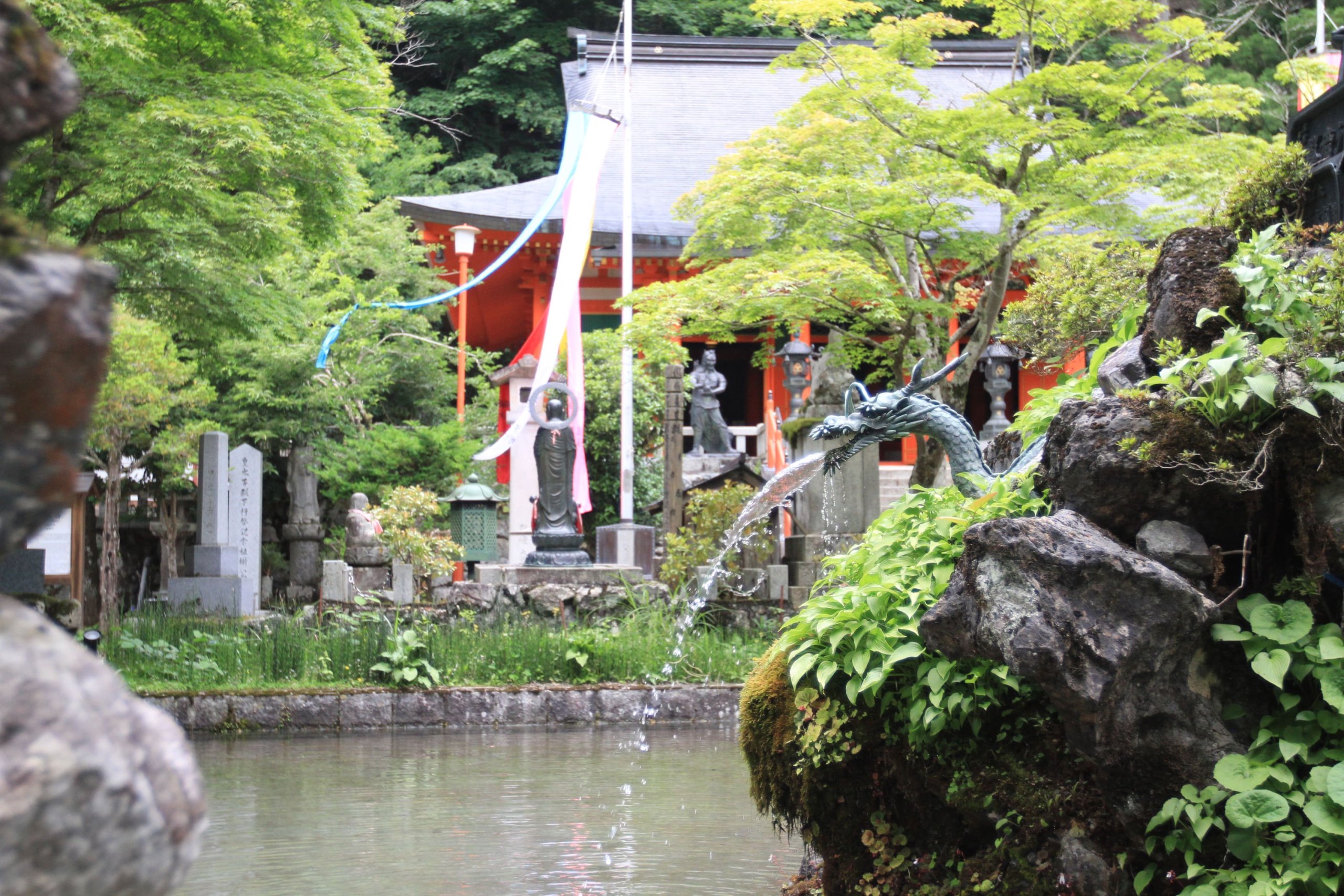 1300年ほど前、役行者が岩から湧き出る水を発見。八大龍王を祀ったのが寺の始まりとされる。本堂前の霊水を湛えた池には水行場が設けられ、いまも大峯山に登る修験者は、ここで心身を浄めたのちに入山する。