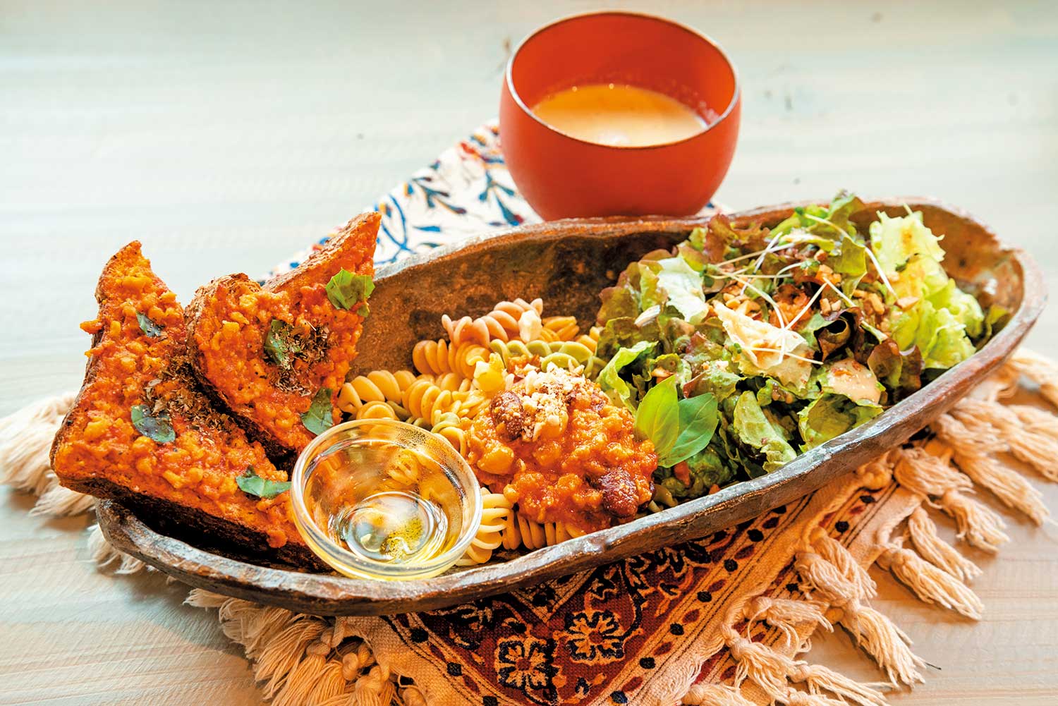 ソイミートとオーガニックトマトのミートソースをのせた、雑穀パンとベジパスタのセット1848円。