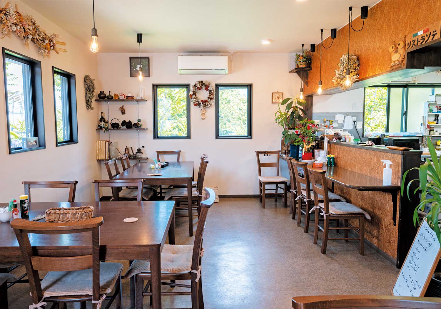 サラダ、スープが付いたパスタ、リゾット、ピッツァランチは1200円〜。女将さん手作りのリースも素敵。