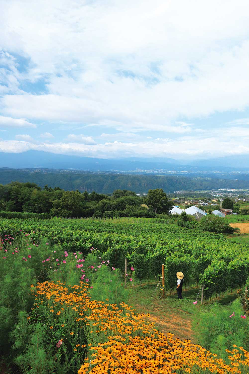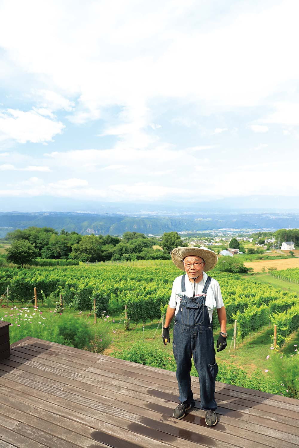 「快晴時は富士山も見えます」とは、10年前に千曲川右岸の糠地(ぬかじ)地区でブドウ作りを始めた『テールドシエル』の池田岳雄さん。第二の人生を考え、還暦から全財産をつぎ込み、放置された桑畑を開墾した。
