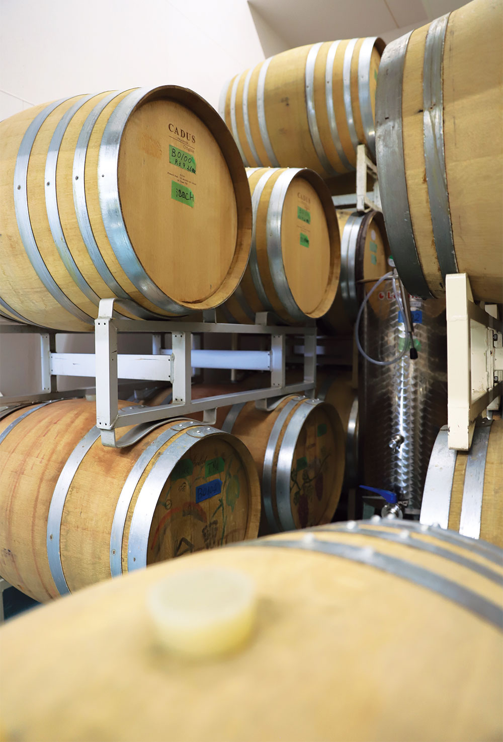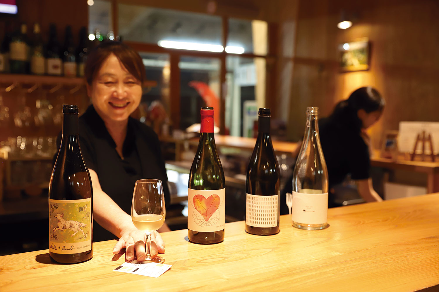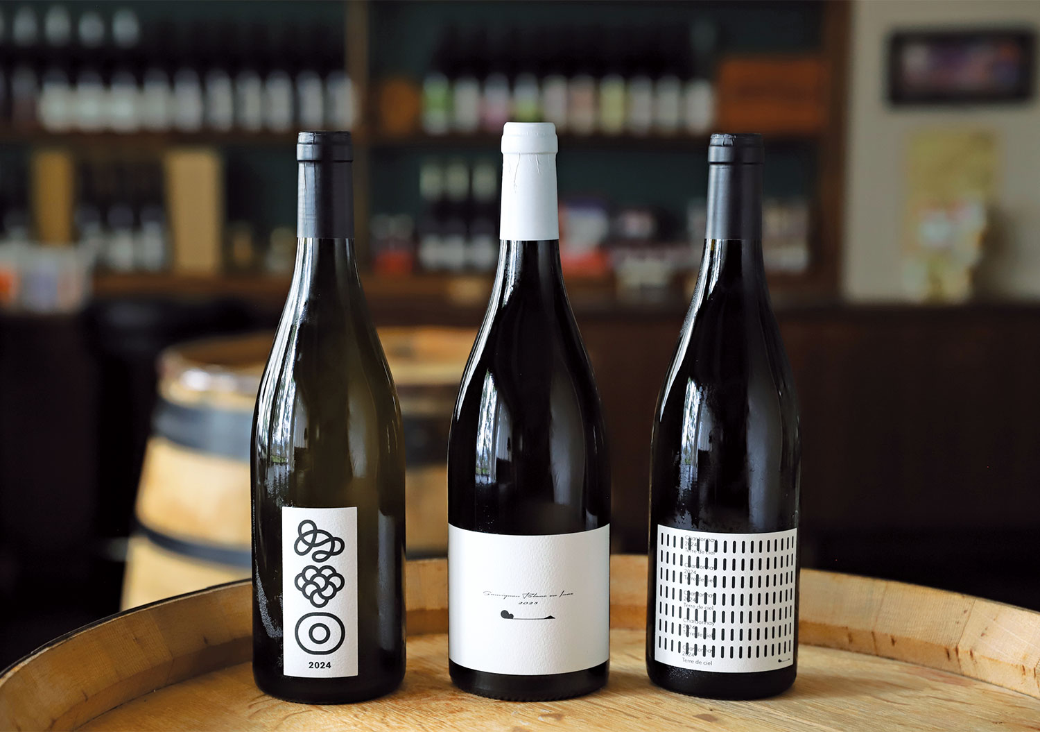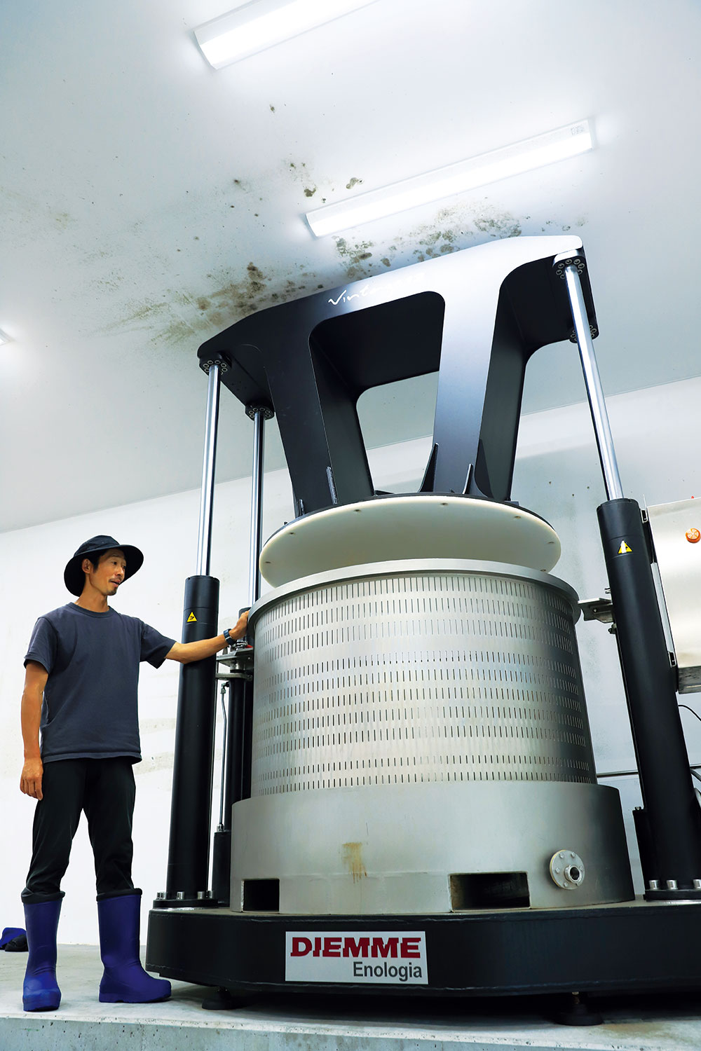 糠地地区で10種のブドウを栽培。野生酵母で発酵し、無濾過(ろか)・無清澄(せいちょう)にこだわるのは「心に残るテロワールをワインで表現したいから」と桒原さん。垂直式プレス機を用い、36時間もかけてブドウを搾ることで雑味のないクリアな味わいに。