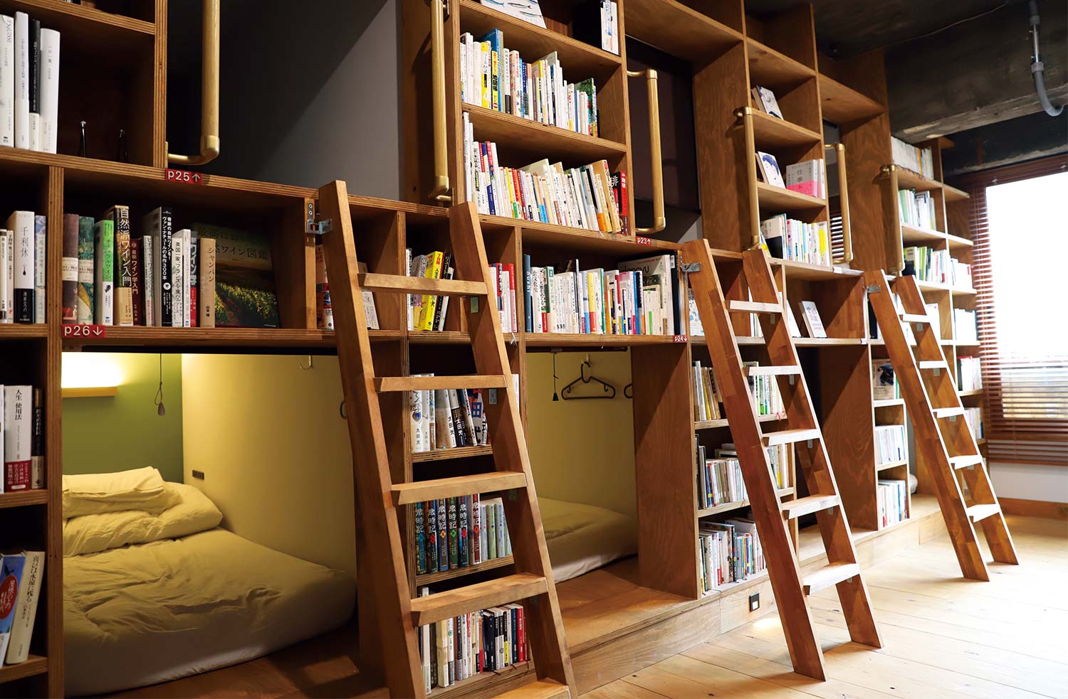 ゲストハウス、カフェバー、古書店が一体となり、旅人も地元の人も憩える場所に。カフェバーでは地元のクラフトビールや世界のナチュールワイン、サイフォンで淹れるコーヒーなどを味わえる。店内の古書は自由に閲覧OK!