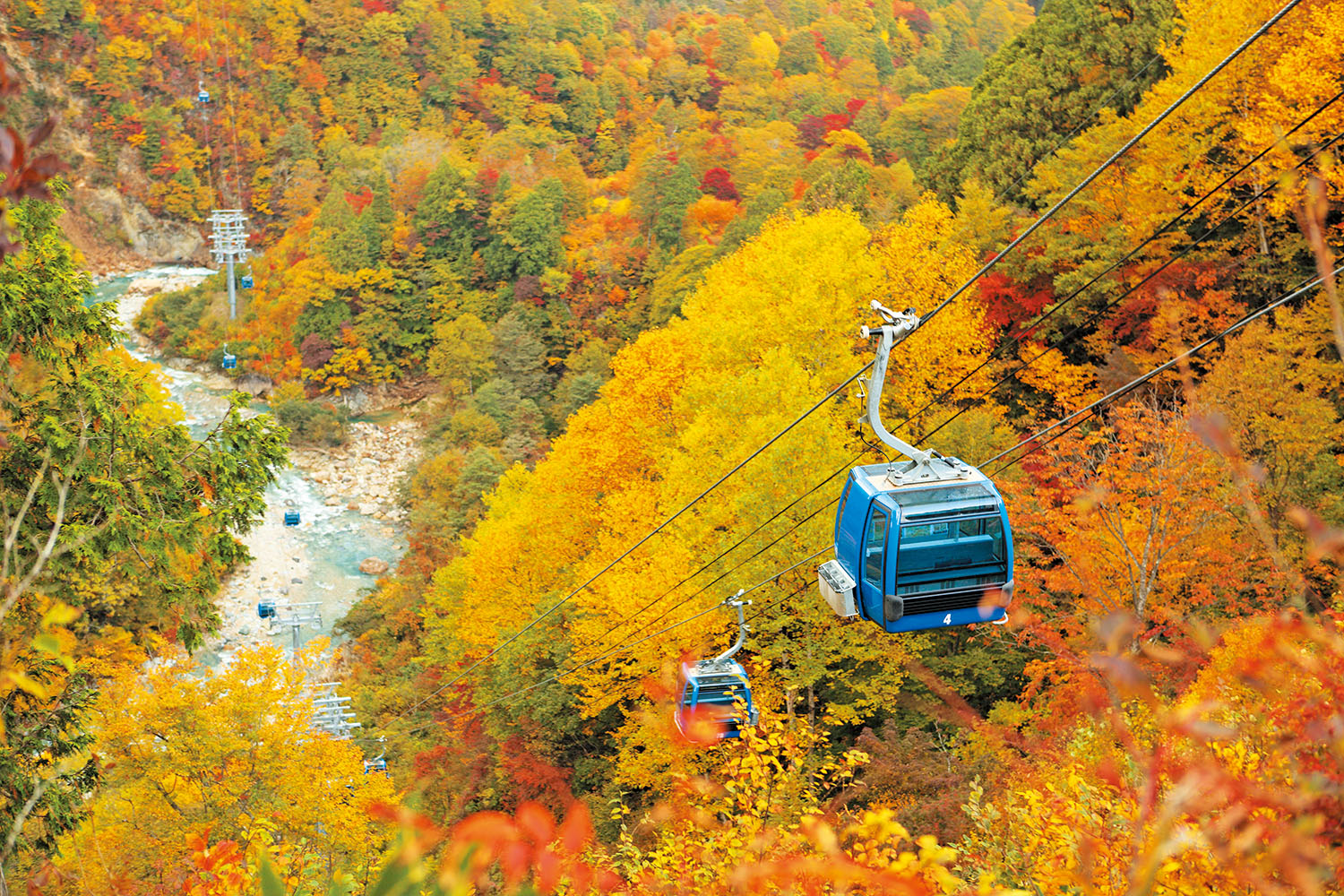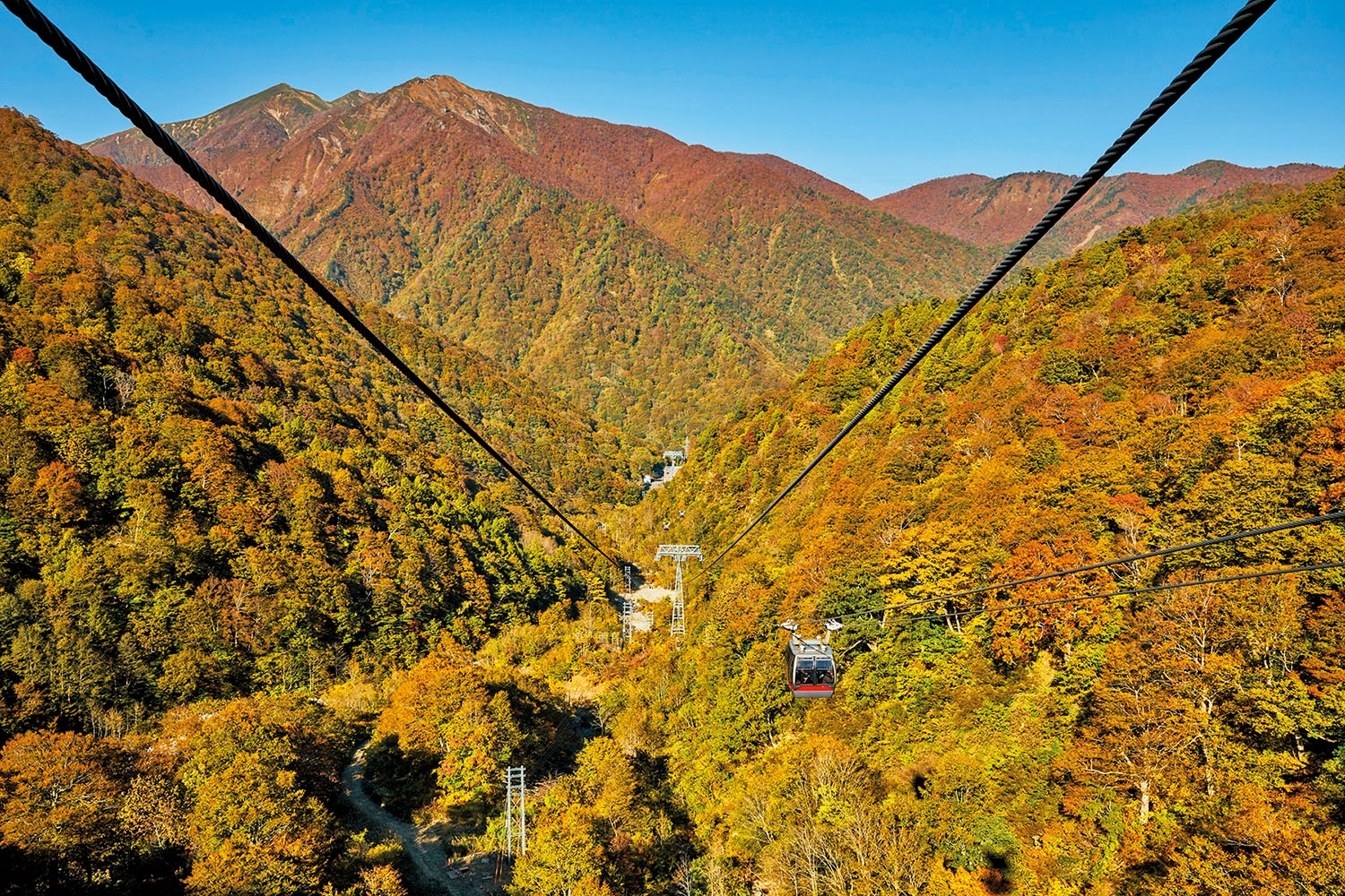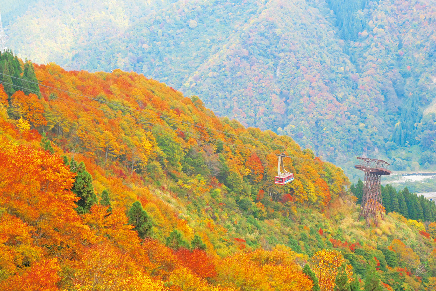 片道約25分、全長5481mと日本最長。縫うように山間を進み、山やエリアごとの紅葉の色づきの違いがよくわかる。