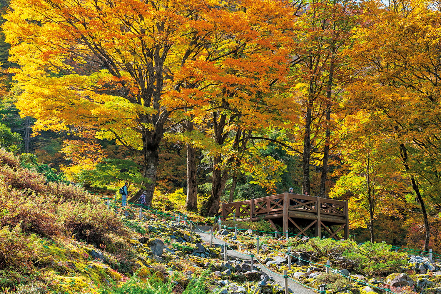 新穂高温泉駅から2つのロープウェイを乗り継ぎ、標高差は1000m以上。2階建てゴンドラの第2ロープウェイからはイロハモミジ、ブナ、ミズナラなど紅葉した山容が圧巻だ。終点の西穂高口駅では槍ヶ岳や西穂高岳などを展望。