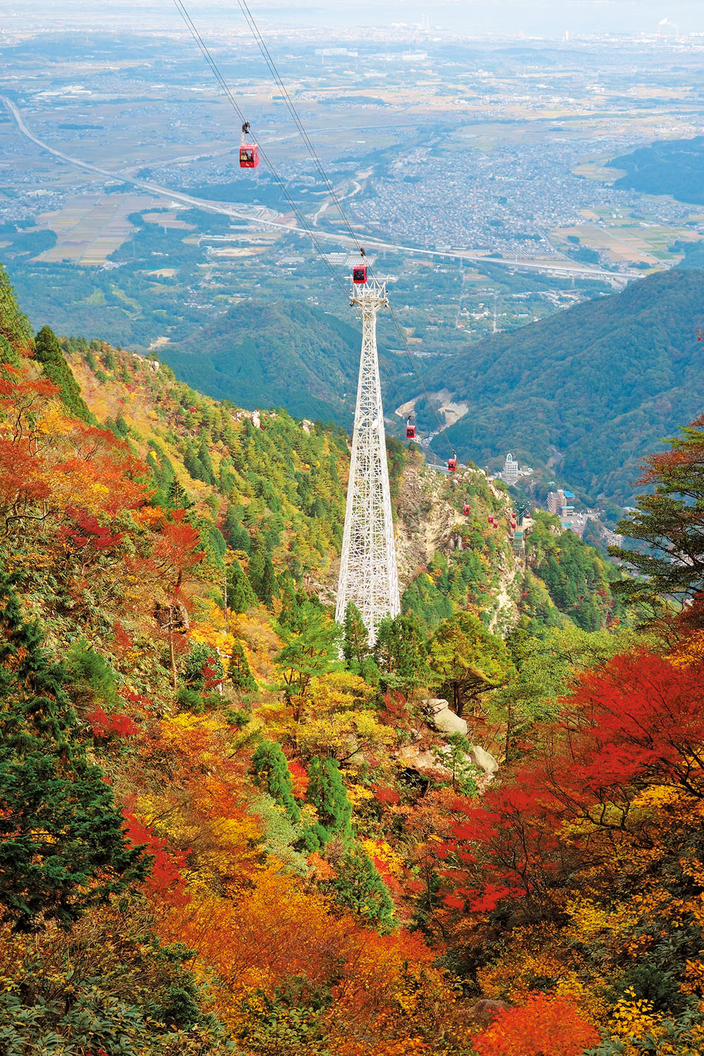 湯の山温泉と鈴鹿山脈の主峰・御在所岳(ございしょだけ)の山頂を結ぶ。ロープウェイの6号支柱、通称「白鉄塔」は61mと日本一の高さを誇り、切り立った岩肌と赤や黄色の木々の光景はまるで錦絵のよう。見頃は山頂~中腹~温泉街と移っていく。