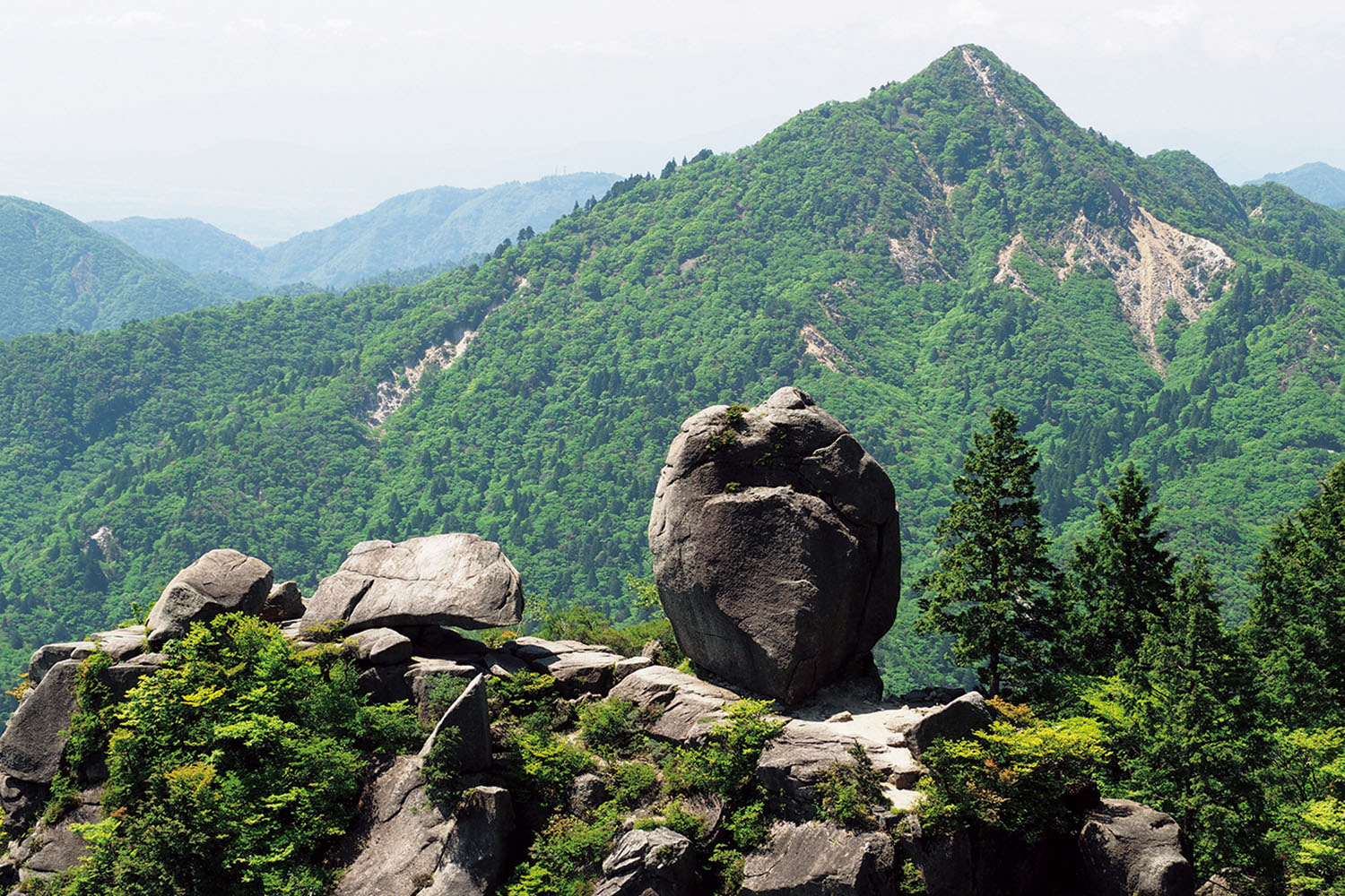 花崗岩で形成された御在所岳には、長い年月をかけて風化してできた奇岩が点在。白鉄塔周辺では鷹見岩や恵比寿岩が見られる。