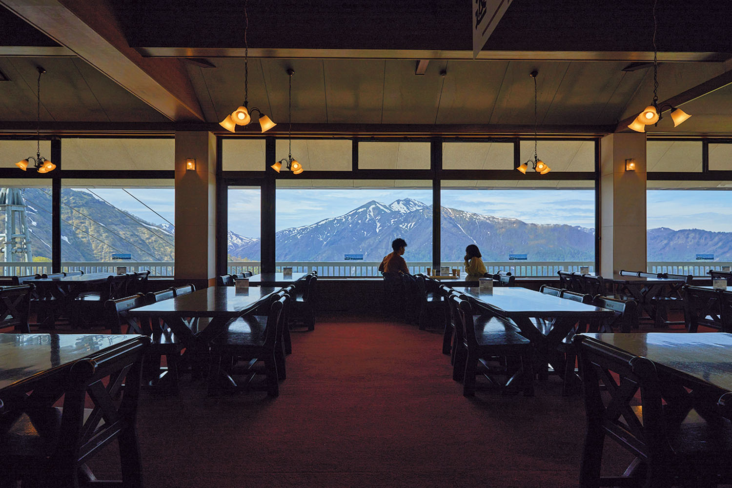天神平駅近くのレストラン『ビューテラスてんじん』からは、窓に谷川岳の雄姿とロープウェイを望む。クラフトビールで乾杯!
