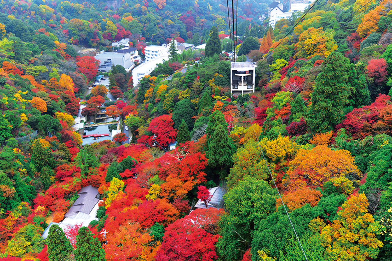 有馬温泉と六甲山頂を12分で結び、丹波山地や瀬戸内海を見晴らす。六甲山頂周辺は10月中旬からブナが黄色に、有馬温泉周辺は11月上旬からイロハモミジが真っ赤に染まる。乗務する係員がガイドしてくれるのも魅力。