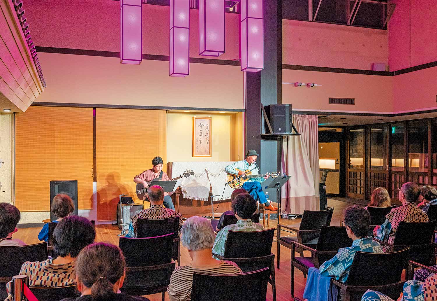 木曜の夜、『日進舘』のロビーでは7代目代表・太田一将さんの澄んだ歌声が響いていた。ロビーコンサートをする宿はたまに見かけるが、365日ライブをしている宿は珍しい。しかも40年という長きにわたって……。