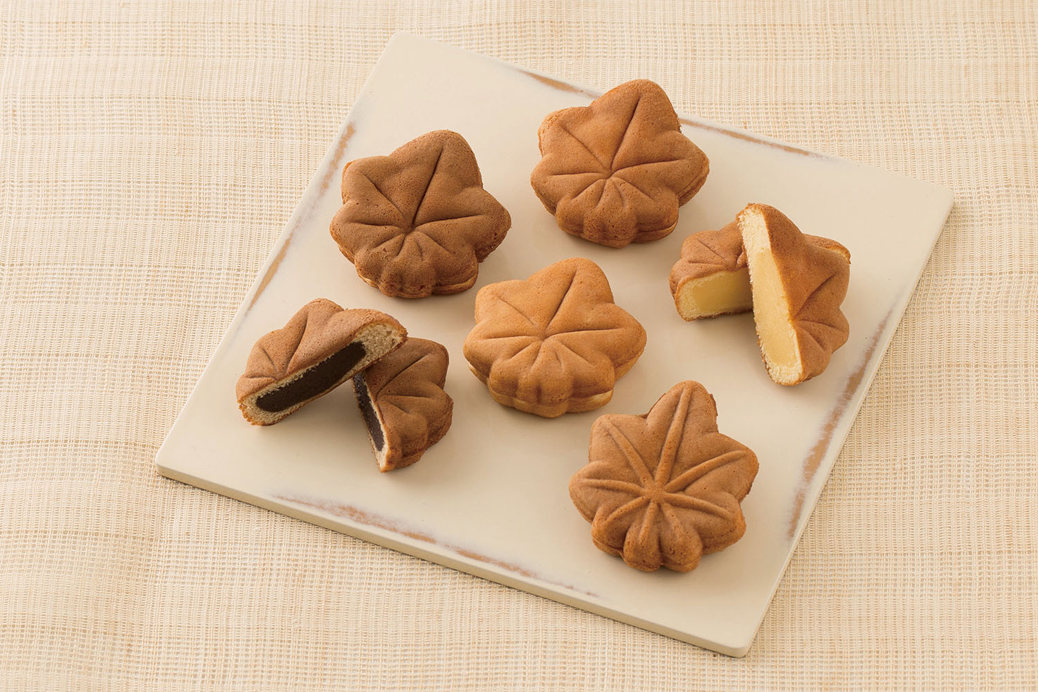 しっとりと焼き上げたカステラ生地に、さまざまなフィリングが入った定番商品。日浦山の麓にある広島県海田町(かいたちょう)の製餡工場で、その土地の良質な水と北海道産小豆でこしらえたこしあんも味わい深い。定番6種類を詰め合わせた錦もみじがおすすめ。