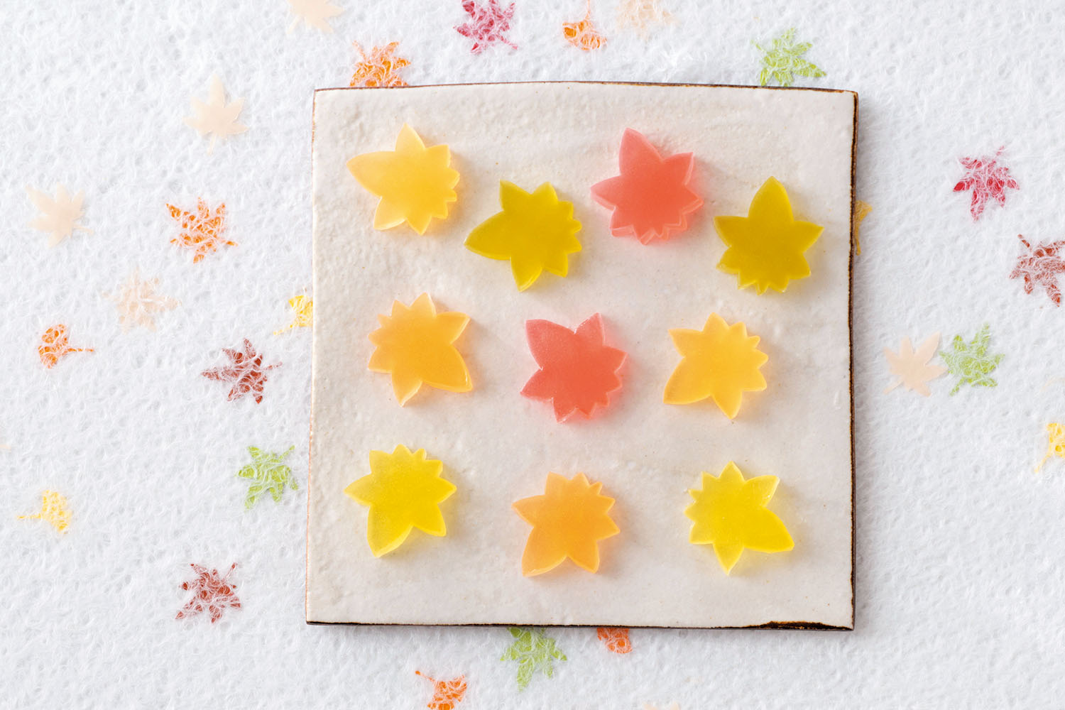 紅色と黄色に染めた練羊羹(ようかん)に錦玉製の紅葉を並べ、紅葉狩りの美しい情景を表現。紅色には少し黒糖と小豆の黒羊羹を加え、深みを出している。甘みがあるため抹茶はもちろん、緑茶、ブラックコーヒーとも相性がいい。
