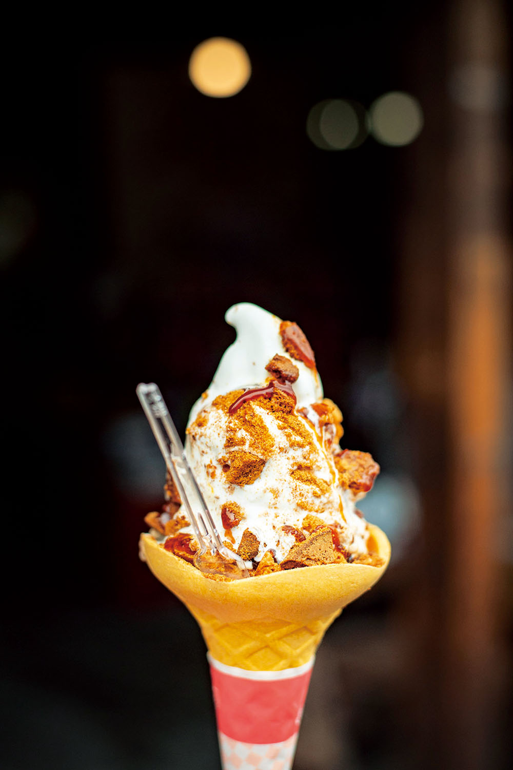 八町大路で「自慢の味噌ソフトクリームはいかが?」と誘われ、『鑰屋(かぎや) カニ醤油』に入った。麦味噌を使ったトッピングがミルク味によく合う。店内には、味噌ジャムの「ジョニーパンディップ」や卵スープの素「坂東タマスプ郎」など、独特なネーミングの味噌と醤油が約50種も並ぶ。
