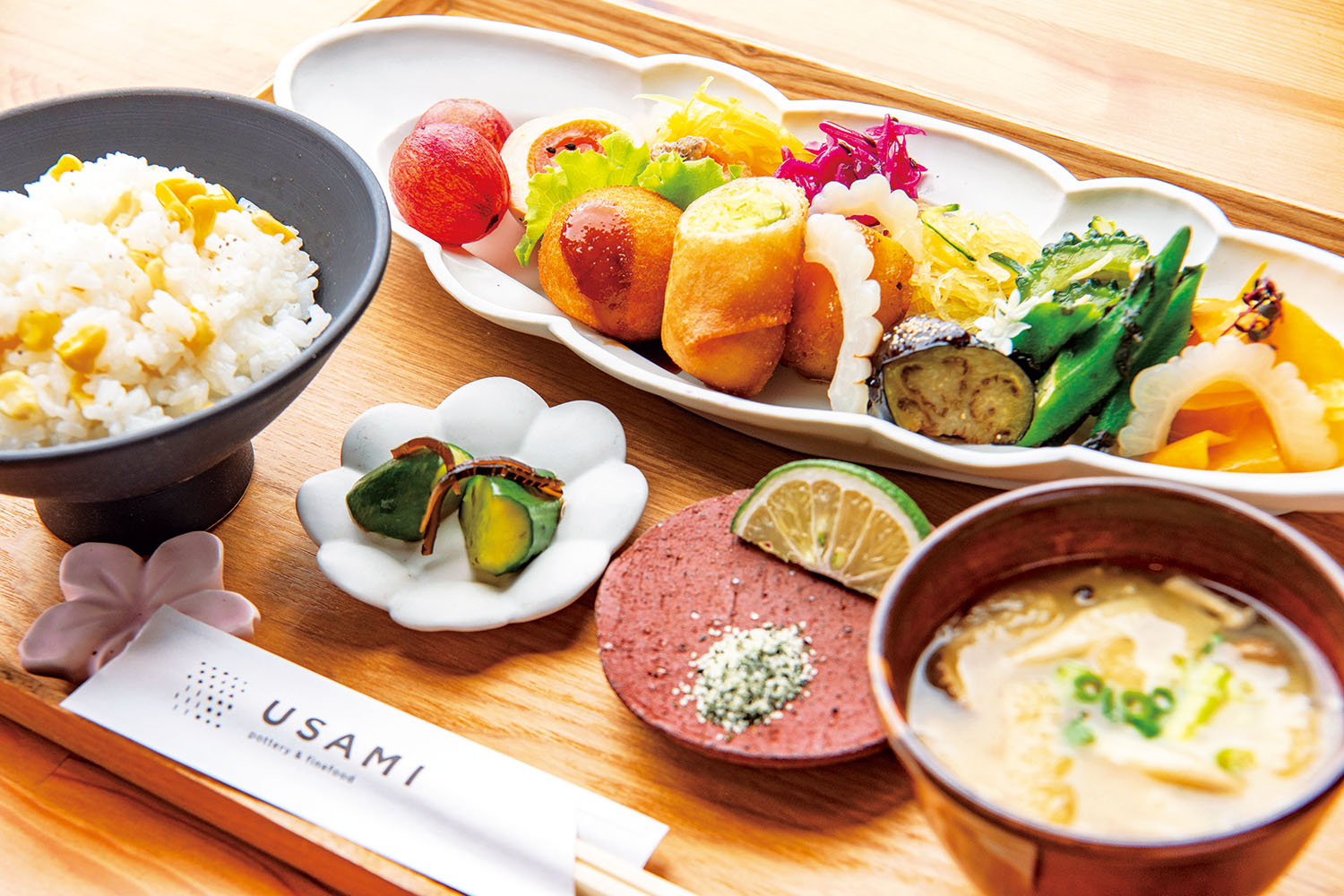 ランチは臼杵石仏近くの『USAMI食堂』で季節のごはんを。夫の宇佐美裕之さんが作った器をキャンバスに見立て、宇佐美友香さんが絵を描くように色とりどりの野菜を配置する。