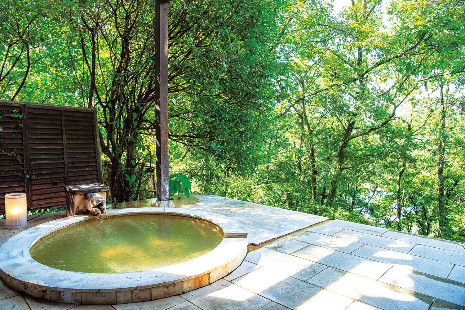 長湯温泉街から車で5分ほどの場所にある隠れ家的な宿。小高い丘に立ち、緑豊かな敷地には図書室や星見やぐらなどが点在。炭酸ガス濃度が高く“日本一の炭酸泉” といわれる源泉かけ流しの風呂は、体の芯まで温めてくれるだけでなく肌もツヤツヤに。