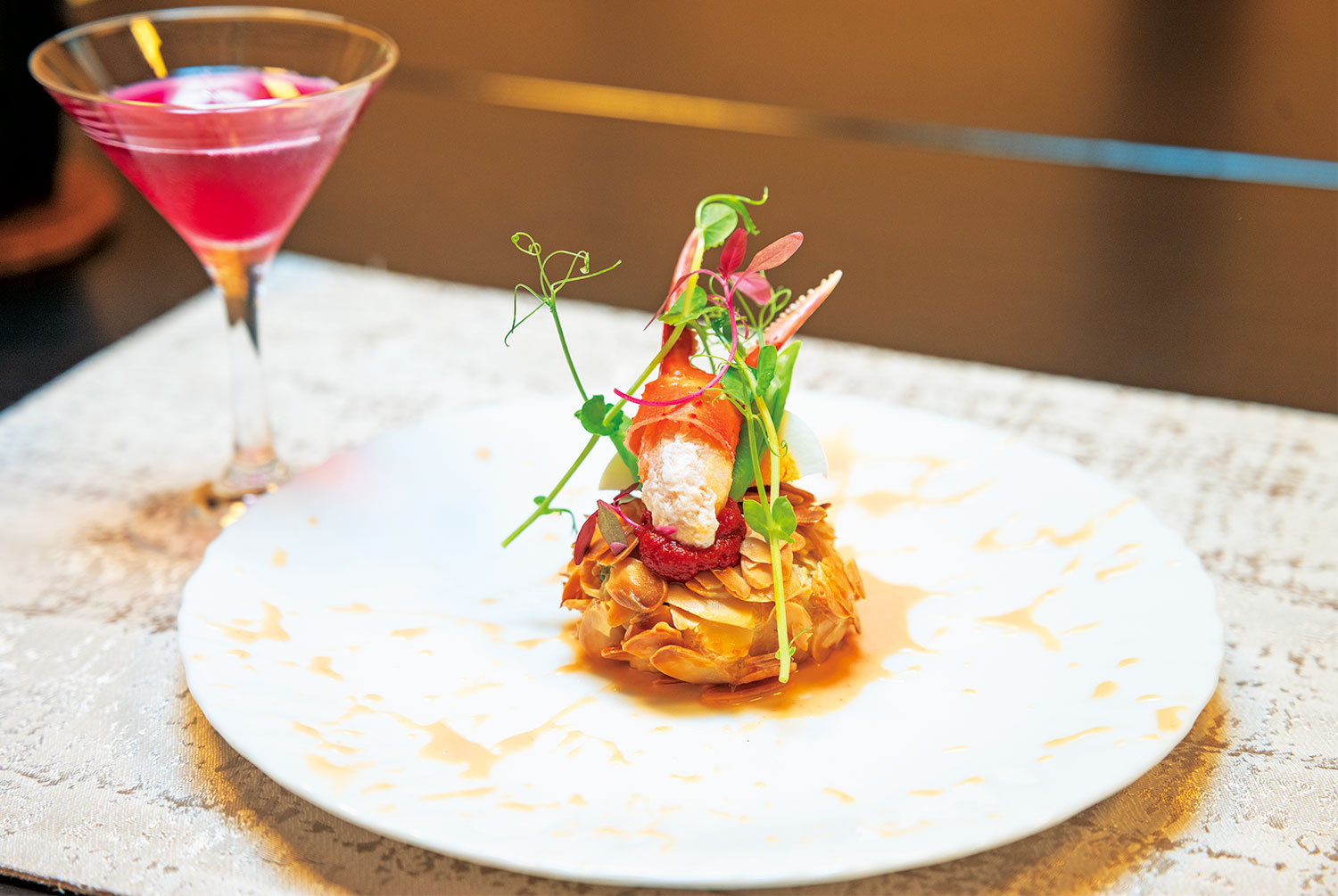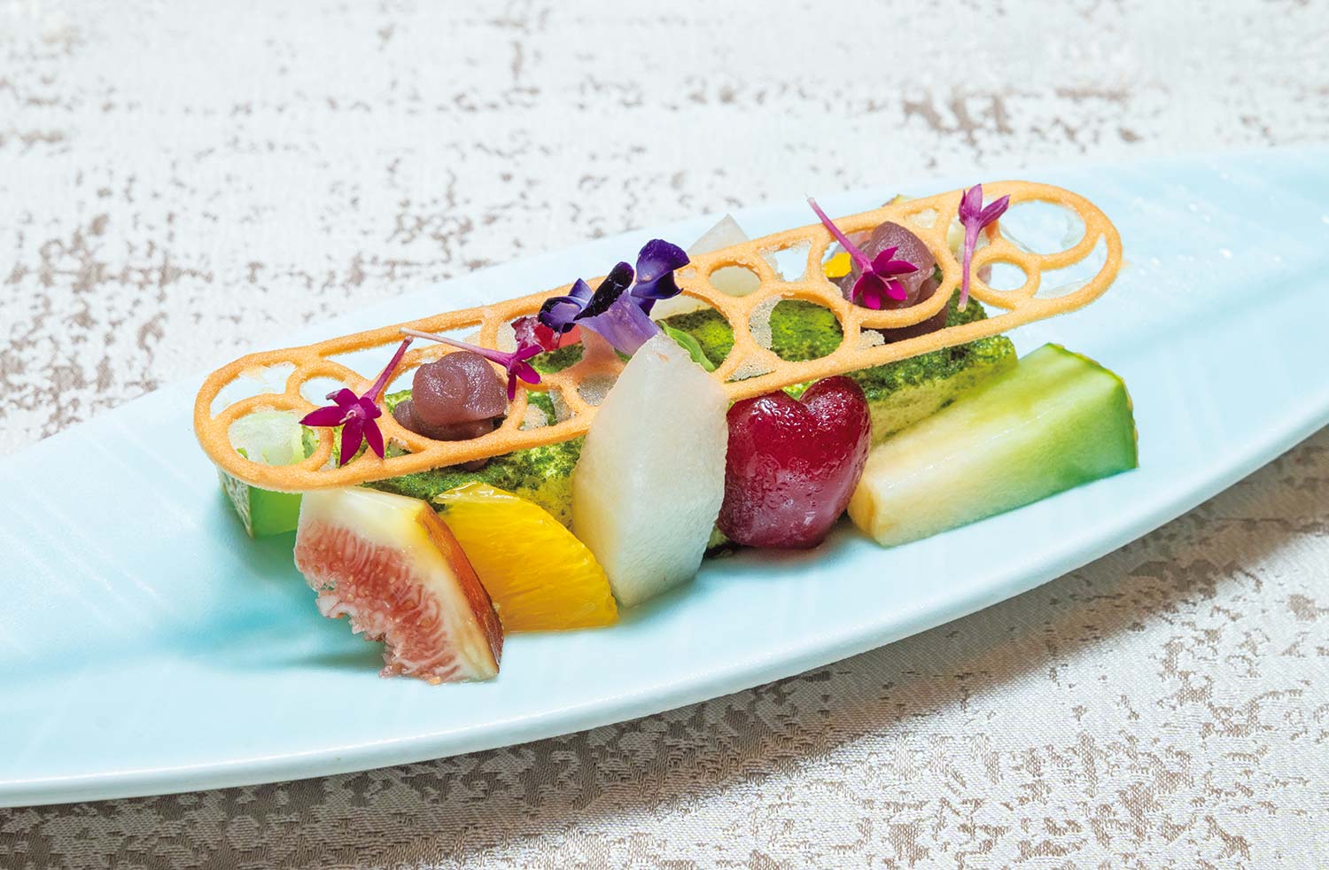 例えば、海鮮サラダにふわりとのせられたムース状の白い「泡醤油」は、冬の日本海の荒波に見られる「波の花」をイメージしたもの。皿につけた梅肉の赤いソースで“味変”を楽しみながら食べられる工夫を凝らした。