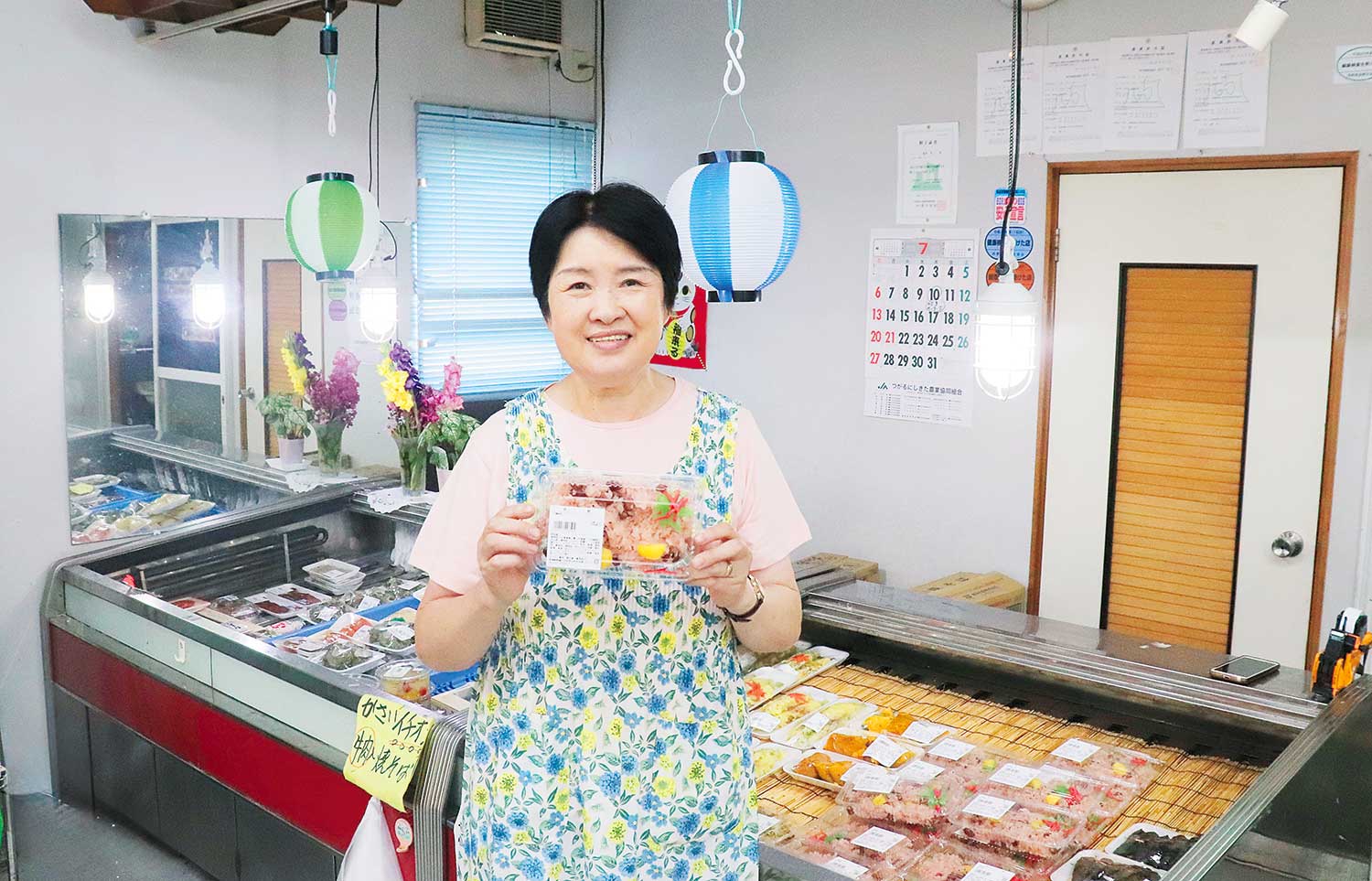 店主の葛西姫子さんが夫の民三(みんぞう)さんと切り盛りする、『スーパーかさい』。店先の「名物・笹餅」と「やきそば」の幟が強い潮風に、はためいています。