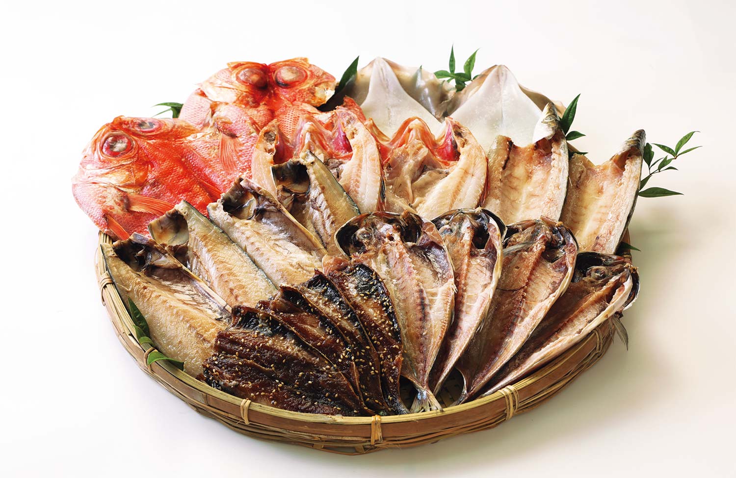 伊豆赤沢海洋深層水で手作りした干物は、酸化防止剤、アミノ酸、着色料などを不使用。「干物店は数あれど、無添加は珍しい」と竜太郎さんもおすすめする。
