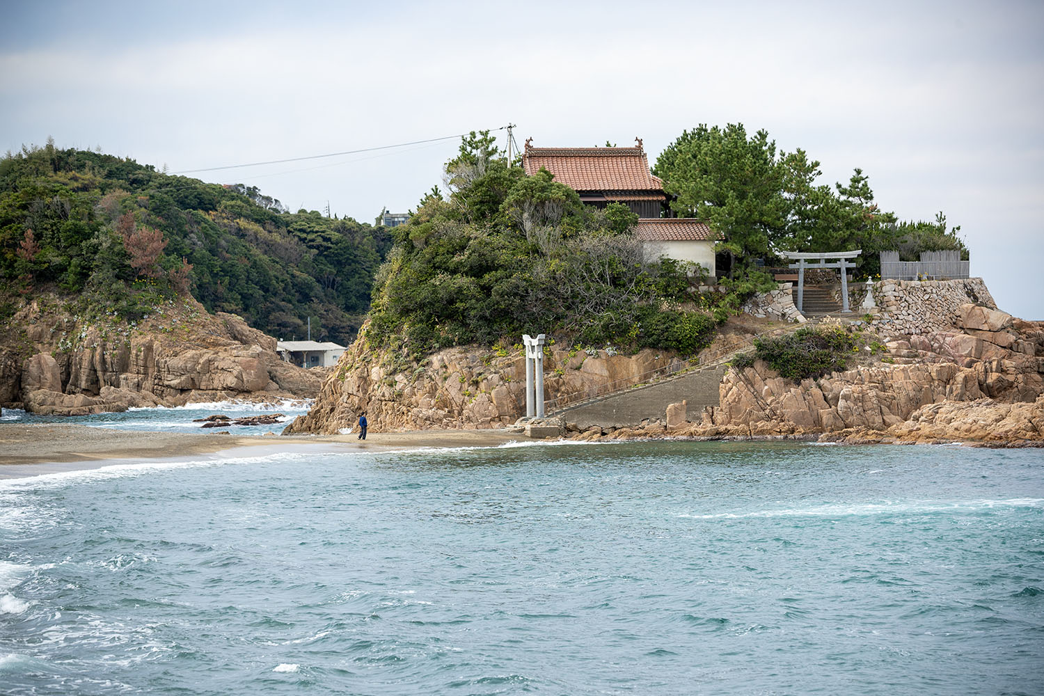 小浜海岸の岩礁・宮ヶ島に鎮座し、主祭神は事代主之命(ことしろぬしのみこと)。島根半島の東端にある美保神社から分霊され、漁業の守り神として信仰される。満潮や荒天で参道が消え、島へ渡れなくなることがあるため“山陰のモンサンミッシェル”とも呼ばれる。