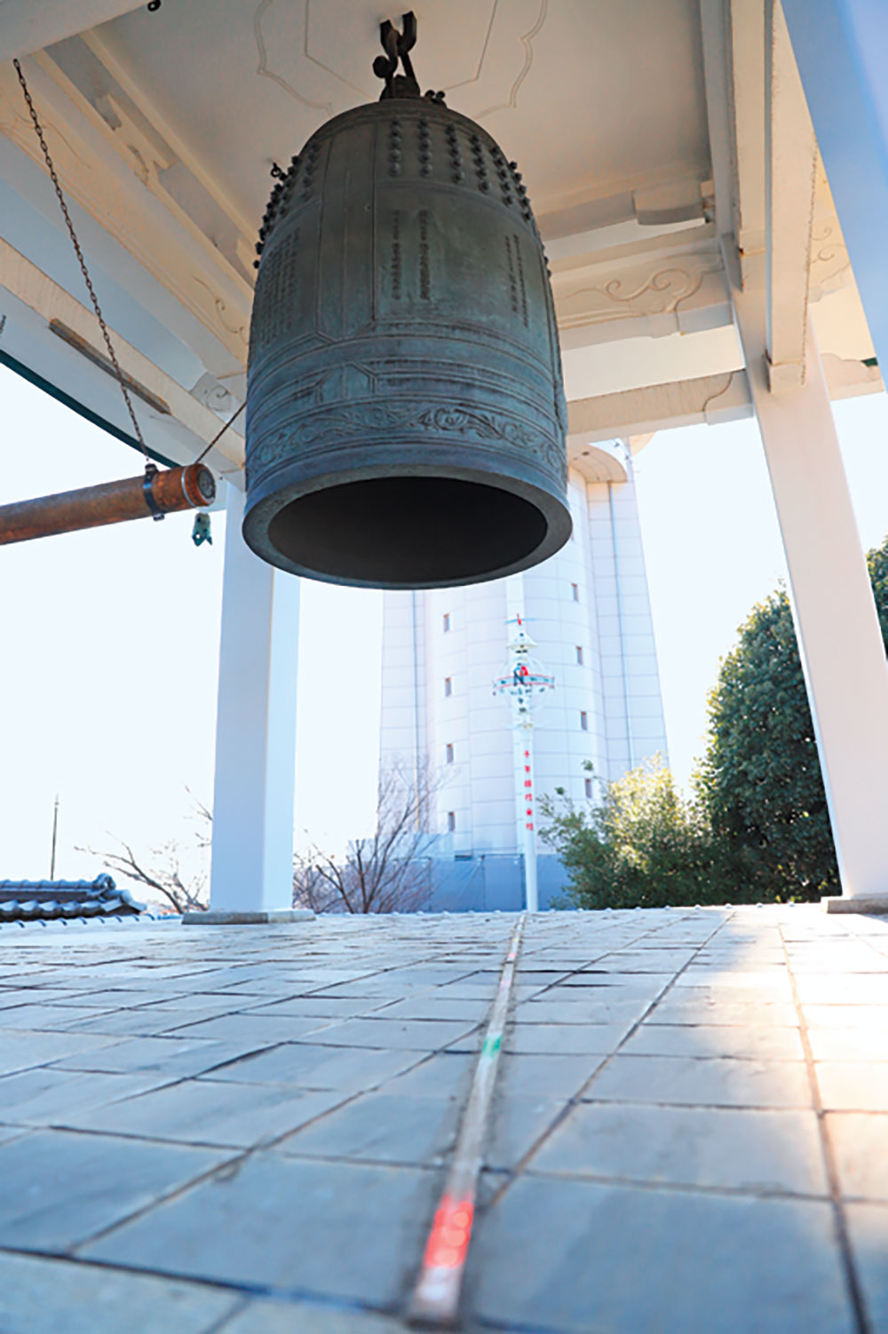 雑木林の坂を抜けると、月照寺へと続く石畳の道が現れた。見上げれば、季節はずれの赤トンボ。東経135度の日本標準時子午線の標示柱である、トンボの標識だ。