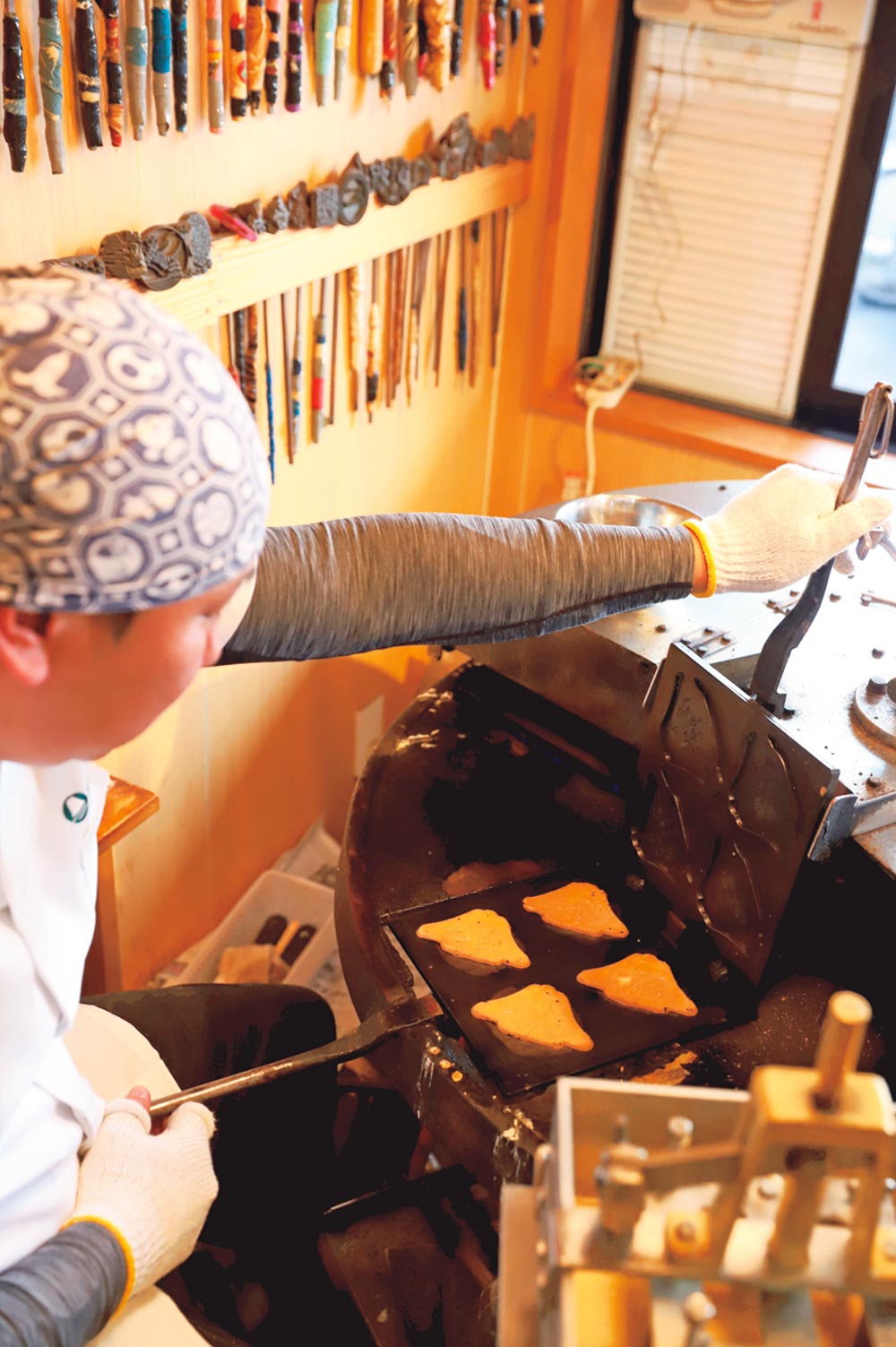 きめ細やかな小麦粉を用いて手焼きするせんべいは、カリッとしつつ口どけよし。6代目・原田貞(ただし)さん考案、明石の味つけ海苔を付けた海峡ちどりや、7代目が考えた卵不使用・ノンたまごおせんちゃん350円などアイデア商品も!