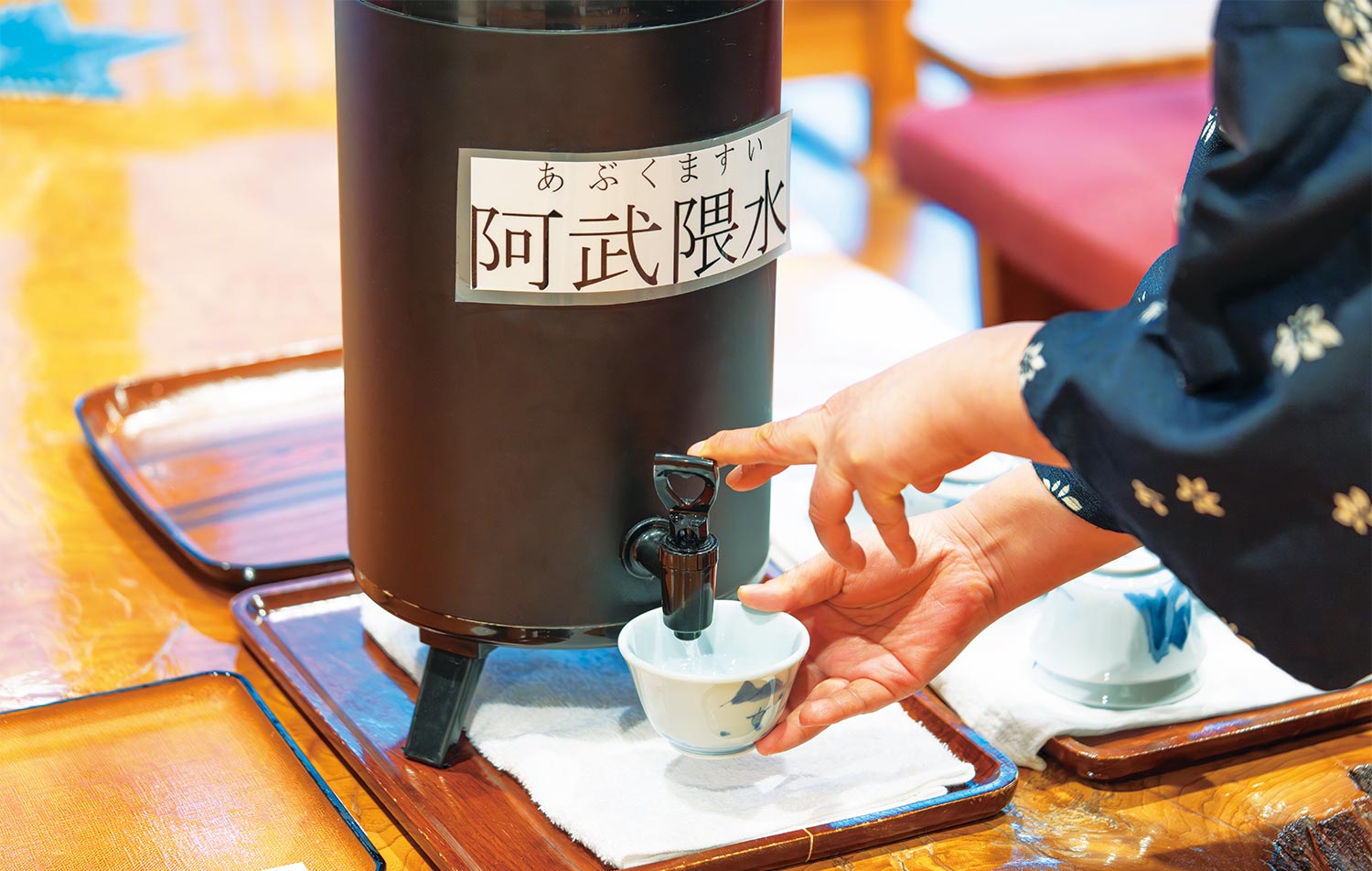 足元の花崗岩の裂け目から自噴する31~34度のぬるめの源泉と、奥にある鳥居の湯口から注ぎ込む44~45度の源泉が、湯船の中で混ざり合っている。