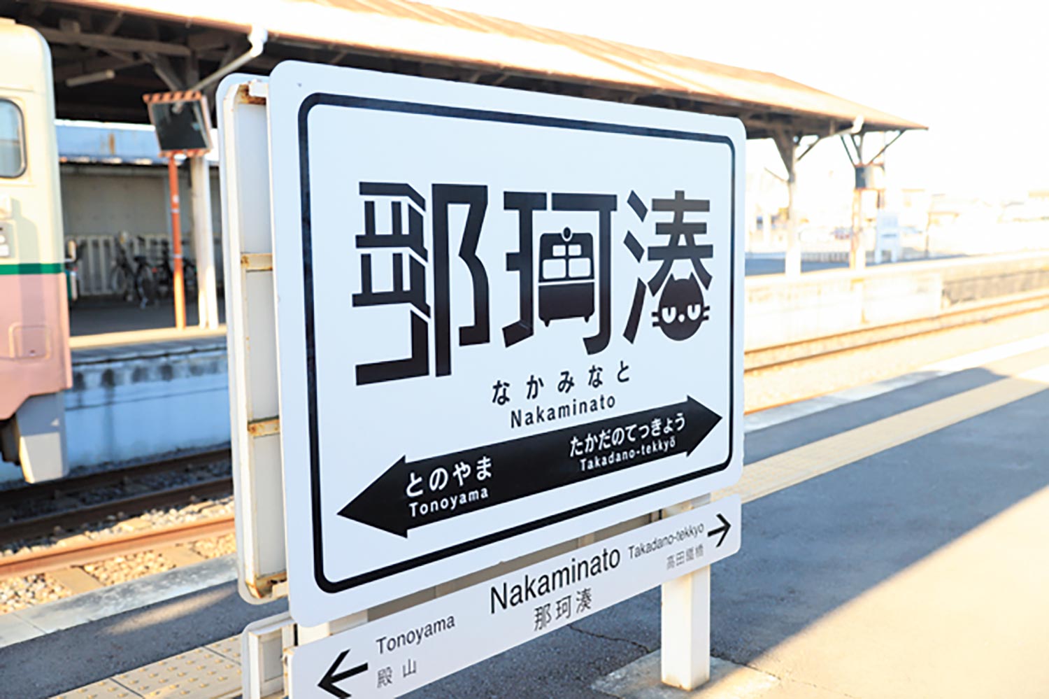 付近の風景や特産品などを盛り込んだ各駅名標にも注目。中根駅から2㎞ほど北東に、虎塚古墳と十五郎穴横穴(じゅうごろうあなよこあな)群といった史跡がある。