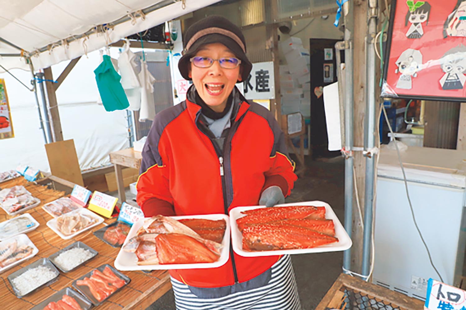 那珂湊の木造駅舎を出たら、漁港の西側にある『那珂湊おさかな市場』へ。干物店の『カクダイ水産』をのぞくと、地魚のアンコウやカレイ、メヒカリと「こんなものまで!」が干物に。
