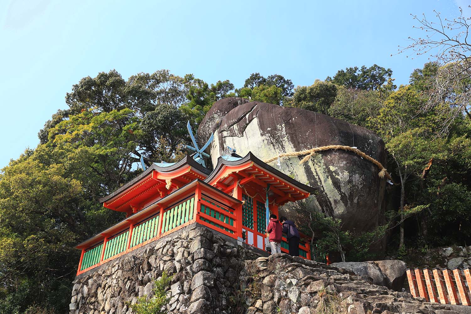 麓の鳥居からおよそ15分、天然石で造られた538段の石段を上りきると、社殿に覆いかぶさるような巨岩が! このゴトビキ岩に熊野の神々が降臨し、岩をご神体とした自然信仰が始まったとされる。