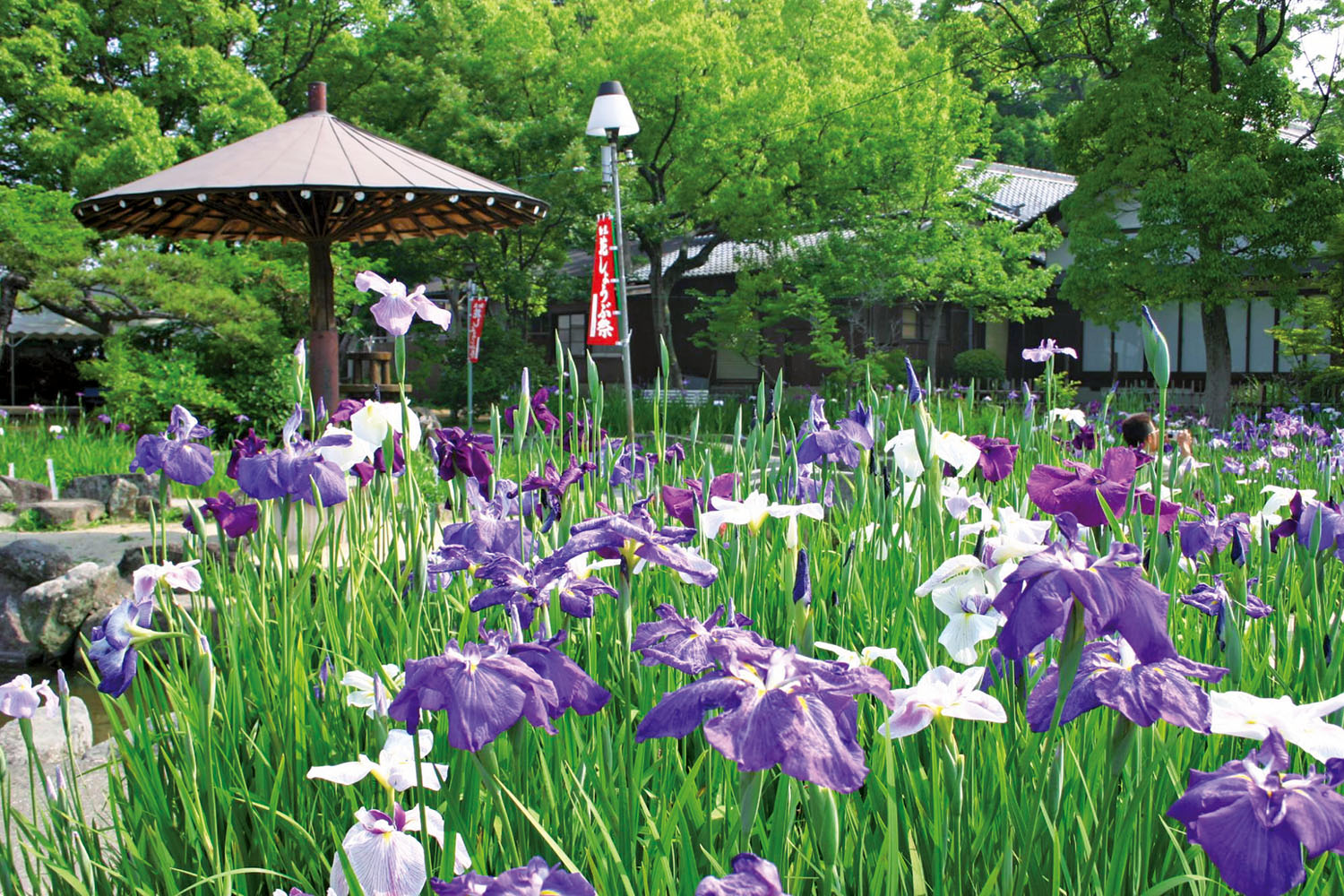 神社に隣接する公園では、明治神宮から下賜された品種を含め、紫や白の花しょうぶが約60種3万本咲き誇る。まつり期間はイベントも目白押し。知立まつりの華として名を馳せるからくり人形の展示・芝居実演も風雅だ。