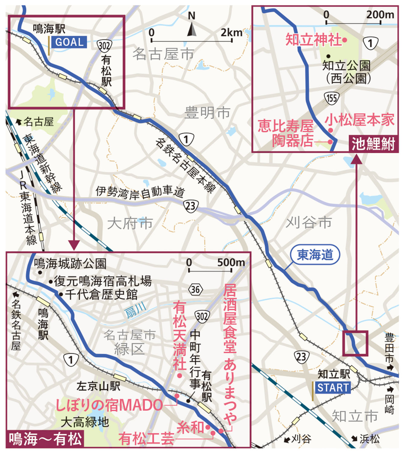 有松を抜ければ、鳴海宿はすぐそこ。史跡や旧家が点在し、旧街道の風情をのんびり目で追いかけたい。