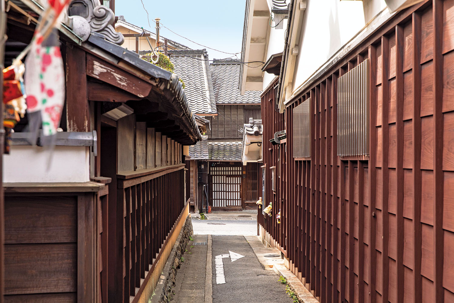 ポツポツとのどかな趣が残る旧街道だが、次なる宿場町・鳴海に向かう途中、忽然と古の町並みが現れた。有松だ。木格子、瓦屋根上の厄除け守り神など、伝統的建物が連なる。
