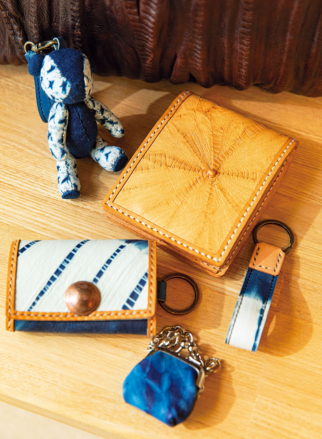絞り職人だった祖母を見て育った佐藤貴広さん。30種以上の有松絞りの技法を学び、木綿のみならず本革でも制作。革を絞り、日焼けさせる技法で特許も取得した。常滑(とこなめ)や淡路島の工房で染めた藍染のモダンな雑貨に男性客も虜だ。