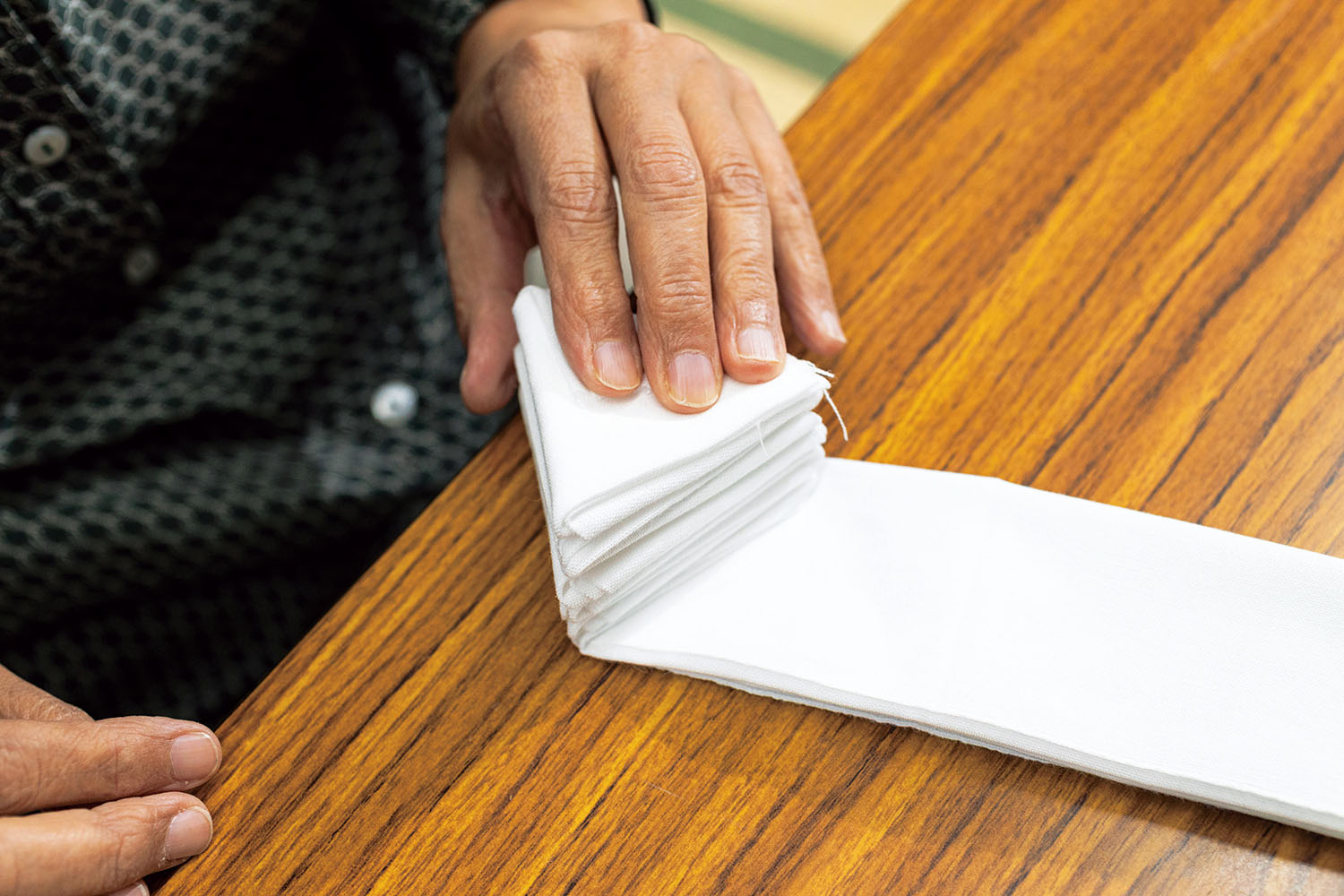 まず、好みのデザインを選択。板締め絞り技法の雪花絞りなら、雪の結晶のような花模様で初心者でも簡単だ。布を蛇腹に折って帯状にし、さらに三角形に折り畳み、2枚の板で挟む。それぞれの辺を好みの色の染料に浸けて水に晒せば完成だ。藍色は染めた直後の黄から緑→水色→藍へ変化。帯幅、折り方、染料の浸し具合で柄が変わる。所要は約2時間。