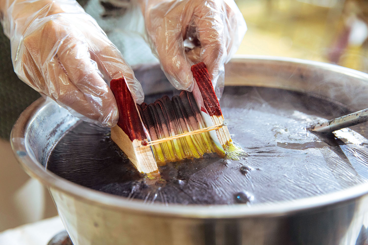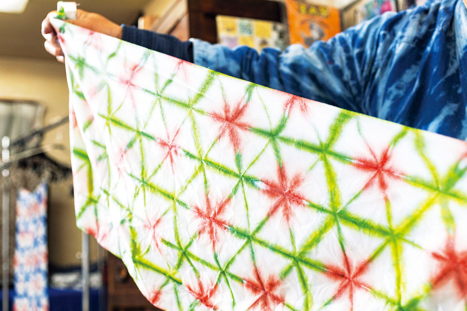 そして、大正時代に化学染料が導入されると、それまでの藍一色から、カラフルな色みへと変貌を遂げた。近年、一時期に比べて廃れたと聞くが、それでも約20軒が本業として続け、若い世代のモダンな店も増えている。