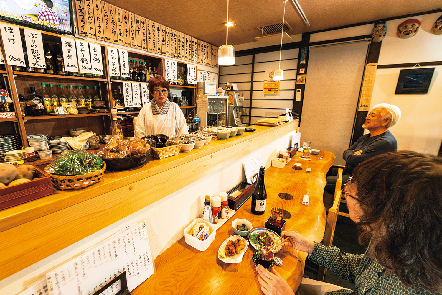 藍染川のほとり。絞り商の蔵を改装して2024年に開店。じゃこおろし、ハンバーグ、煮付けなど、酒肴から定食までそろえ、「子どもだけ行かせるからお願い」と頼りにされる地域の台所だ。愛知、岐阜、三重の地酒も豊富。