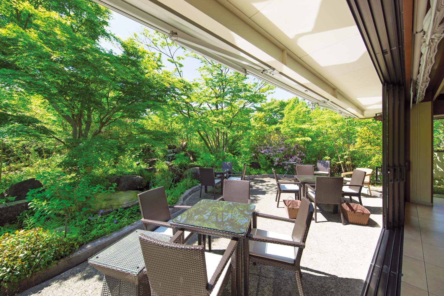 『カフェ&ガーデン しらさぎ邸』木もれ日が風に揺れ、滝の水音が響くテラス
