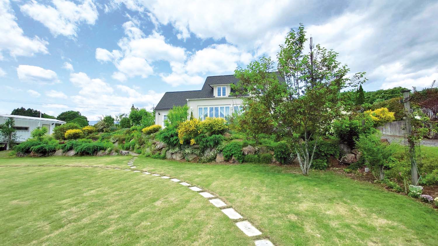 広大な庭は4月中旬に桜並木のトンネル、そのあとに色とりどりのツツジが見頃を迎え、5月中旬にはカフェのテラスの前の丘を純白のレースのようなオルレアが埋めつくす。開放感のあるテラスでのんびりくつろぎながら、季節の花の香りを運ぶやさしい風を感じたい。