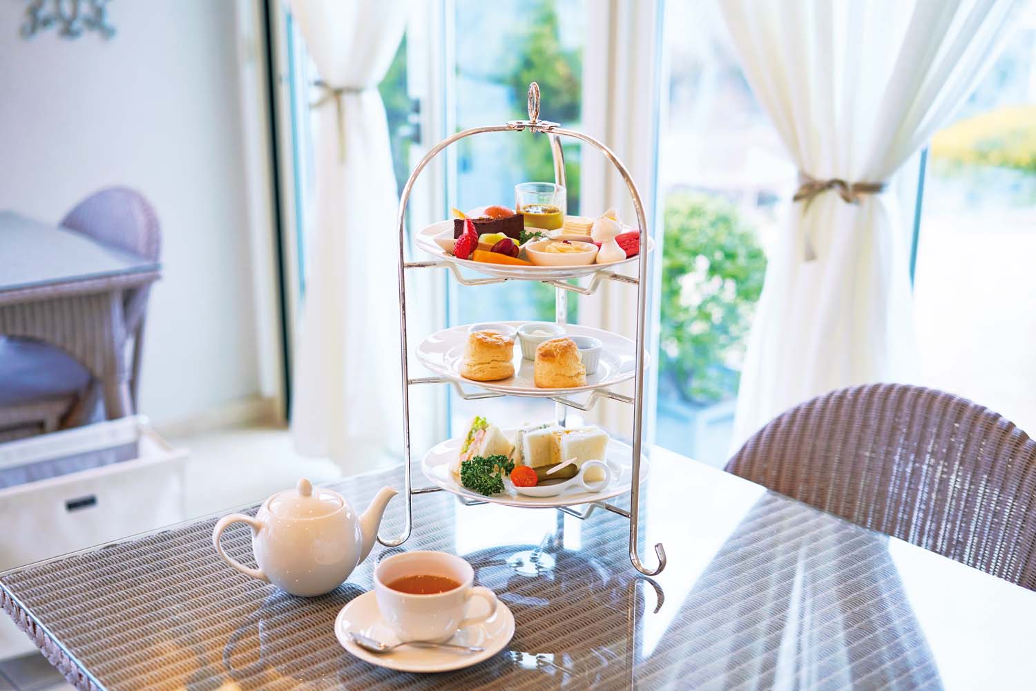 扉を開けるとパリ郊外の邸宅に招かれたよう。サンルームのテラス席からは花が絶えないナチュラルなガーデンを眺められる。季節の手作りジャムを添えたスコーンや、自家製スイーツのアフタヌーンティーセットは必食。