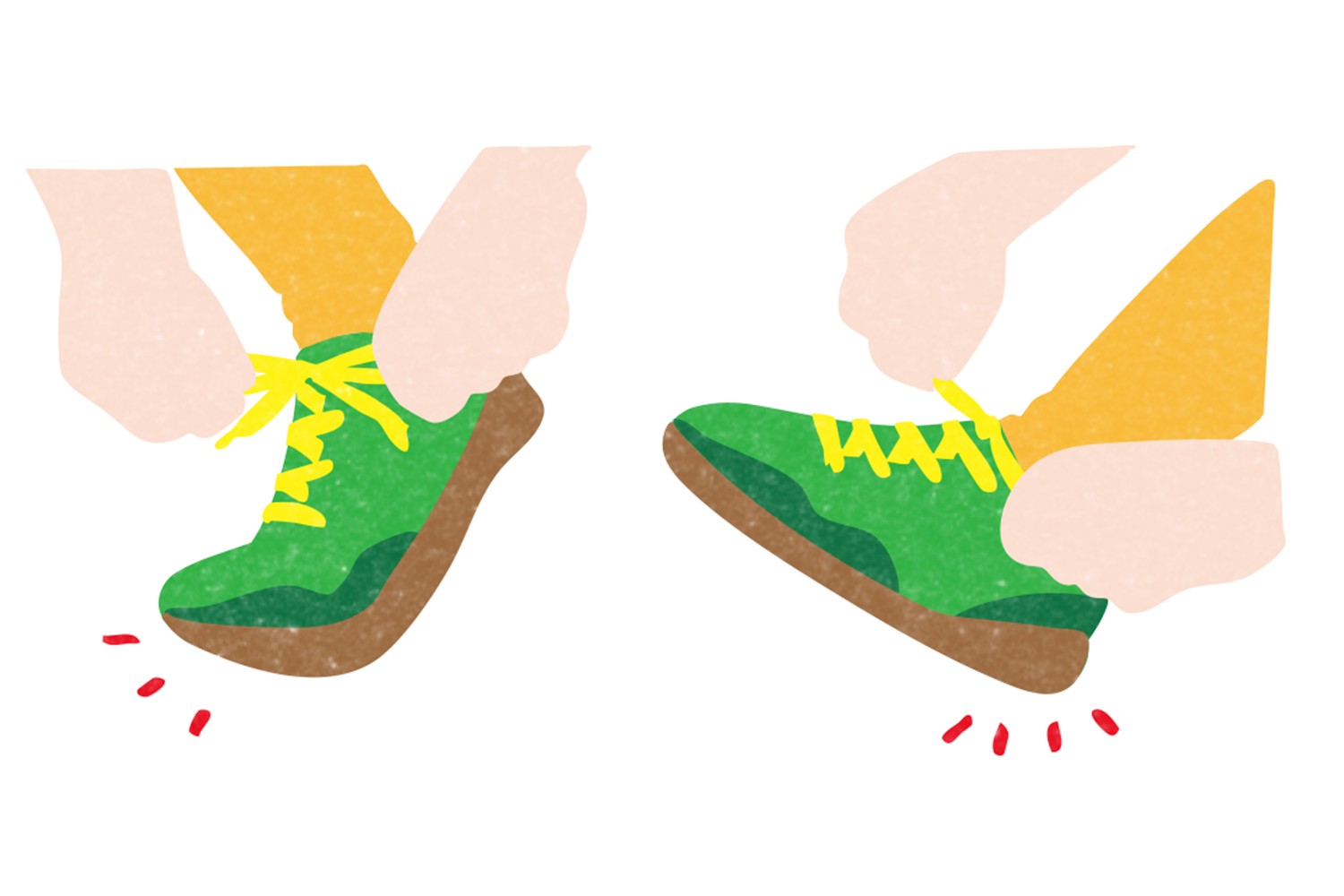 ひもをゆるめてから足を入れ、かかとを地面に叩いて密着させてひもを結ぶ。最後にかかとを上げて足指の付け根が曲がった状態で蝶結びにすると、足の甲とかかとがフィットして歩きやすい。