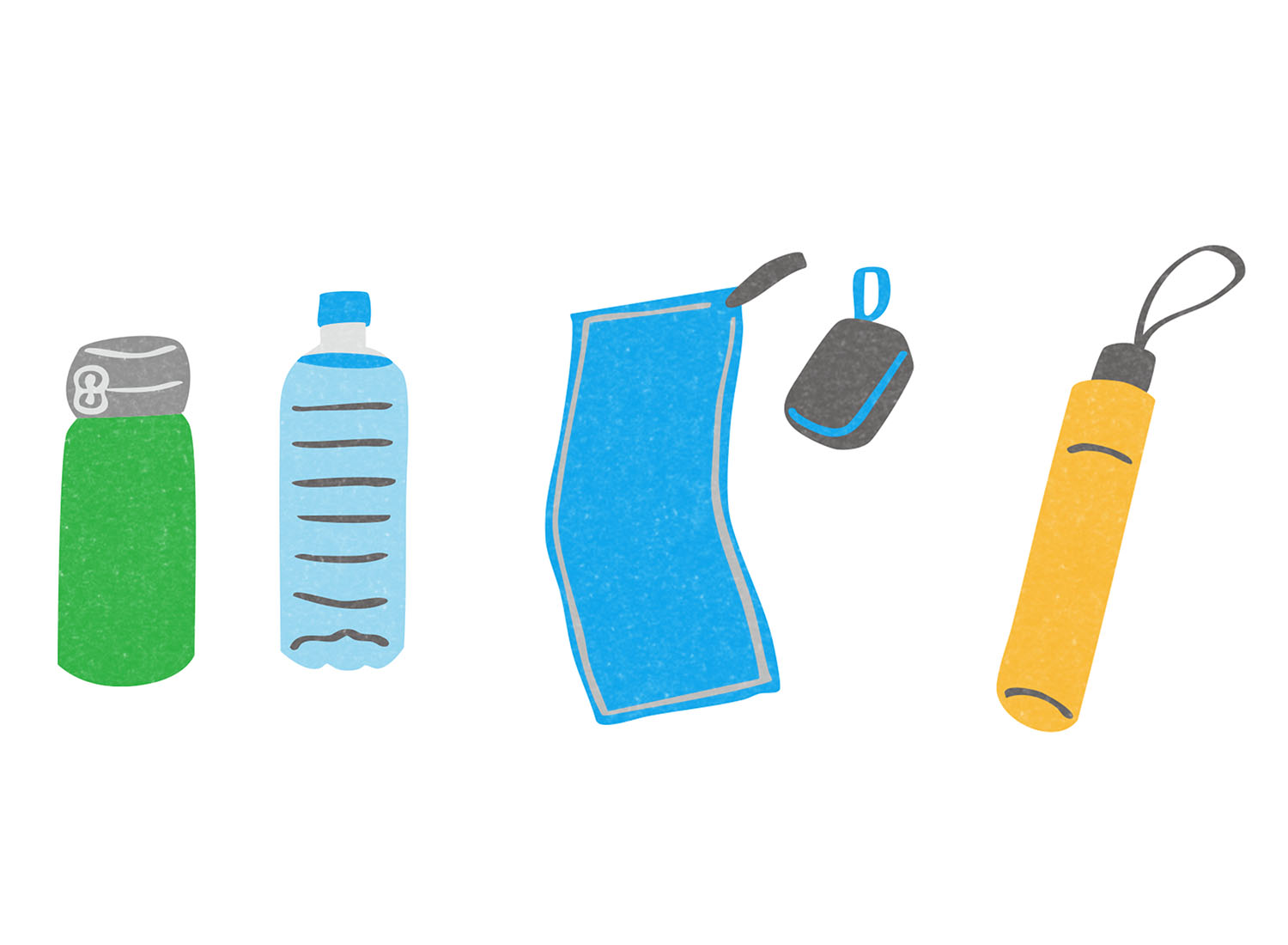 帽子、水筒、タオルは必携。コース上に飲食店が少ない場合は、臨時休業などに備えて軽食(おにぎり、パン)や甘味があるとよい。天候に応じて、折りたたみ傘や日焼け止めを。